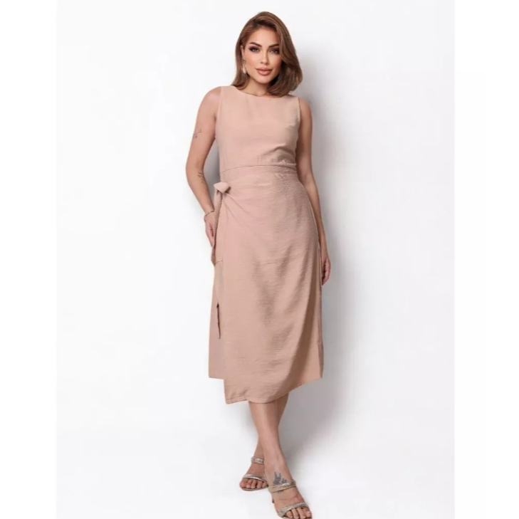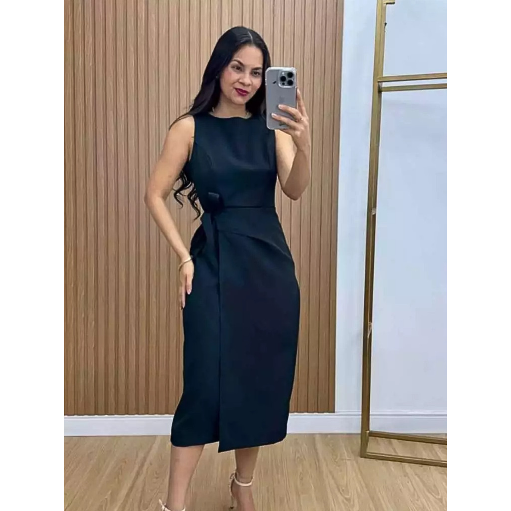 Vestido Feminino Amarração Lateral Alfaiataria Midi Possuí Zíper Social Elegante PMG Look Verão Moda Mulher Evangélica