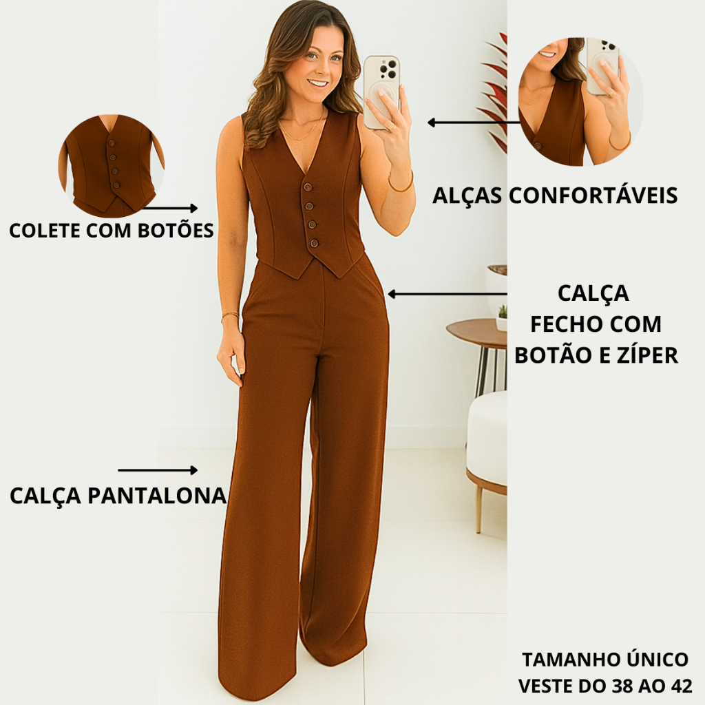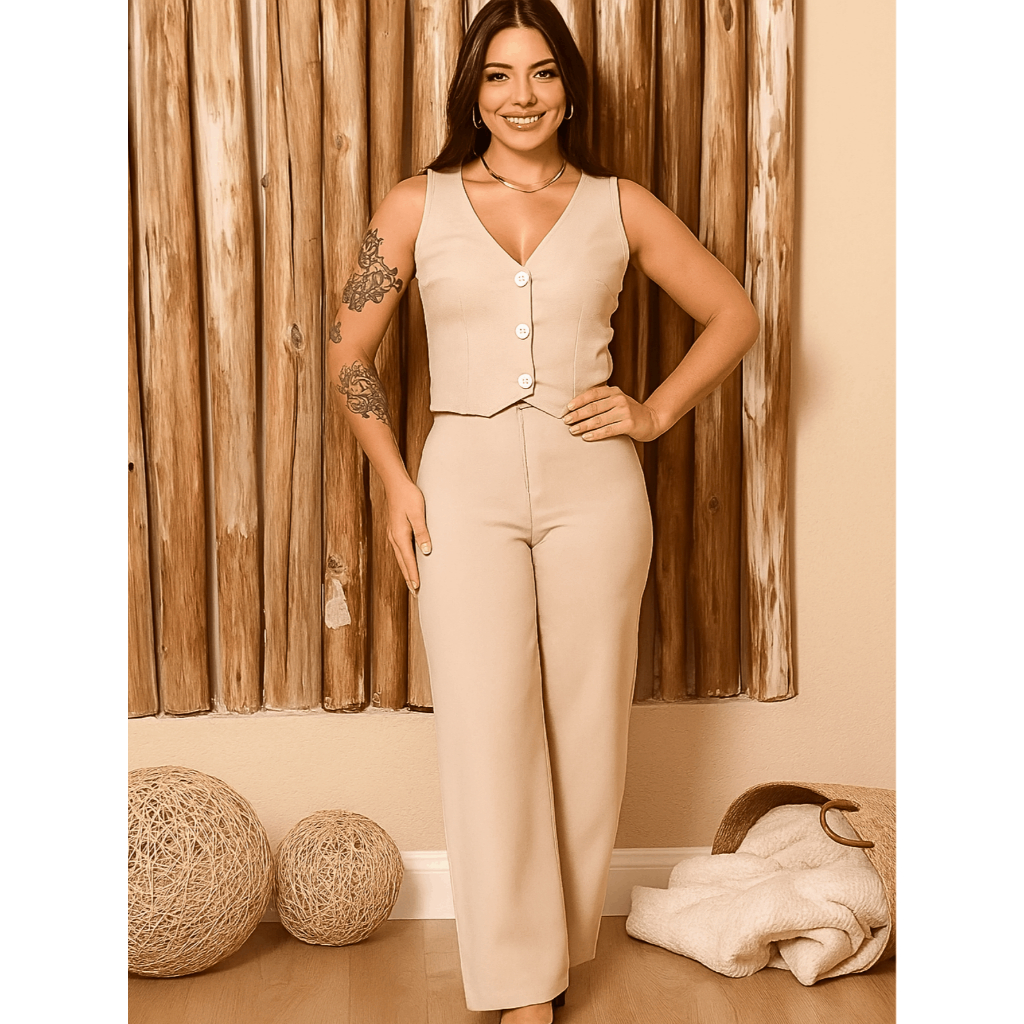 Conjunto Feminino Alfaiataria Blusa Colete Calça Pantalona Social Elegante com Botão Trabalho Festa Moda Evangélica
