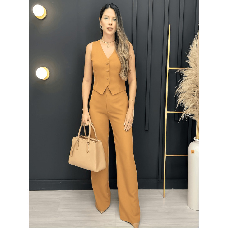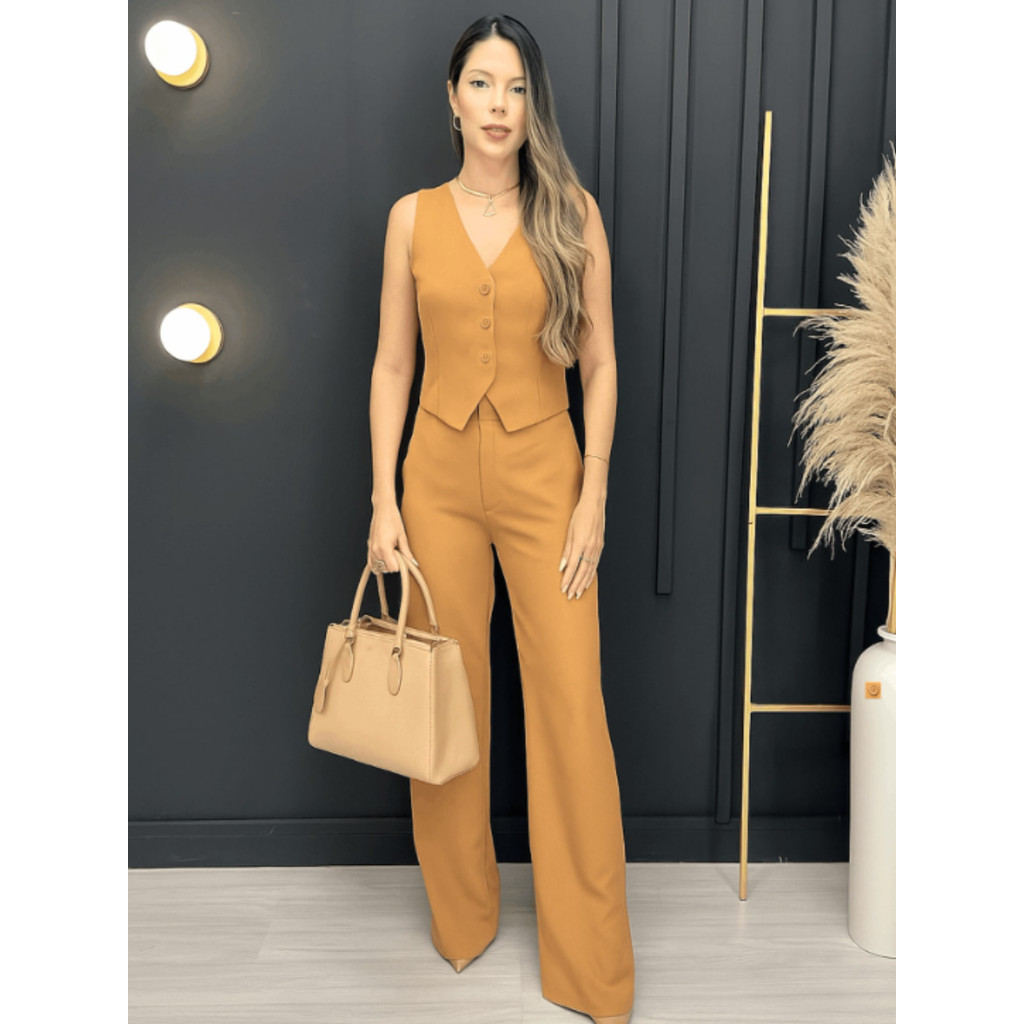 Conjunto Feminino Alfaiataria Blusa Colete e Calça Pantalona Social Elegante com Botão Moda Mulher Evangélica Verão