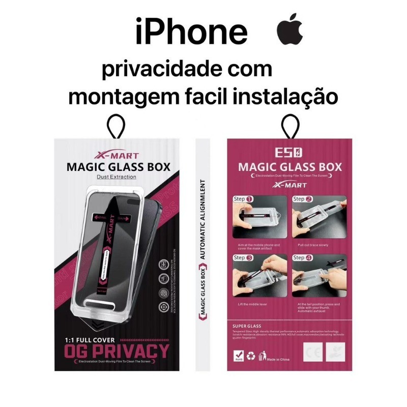 Pelicula Magica de Vidro 3D Privacidade com Montagem iPhone XS XsMax XR 11 12 13 14 15 16 17 Pro Max