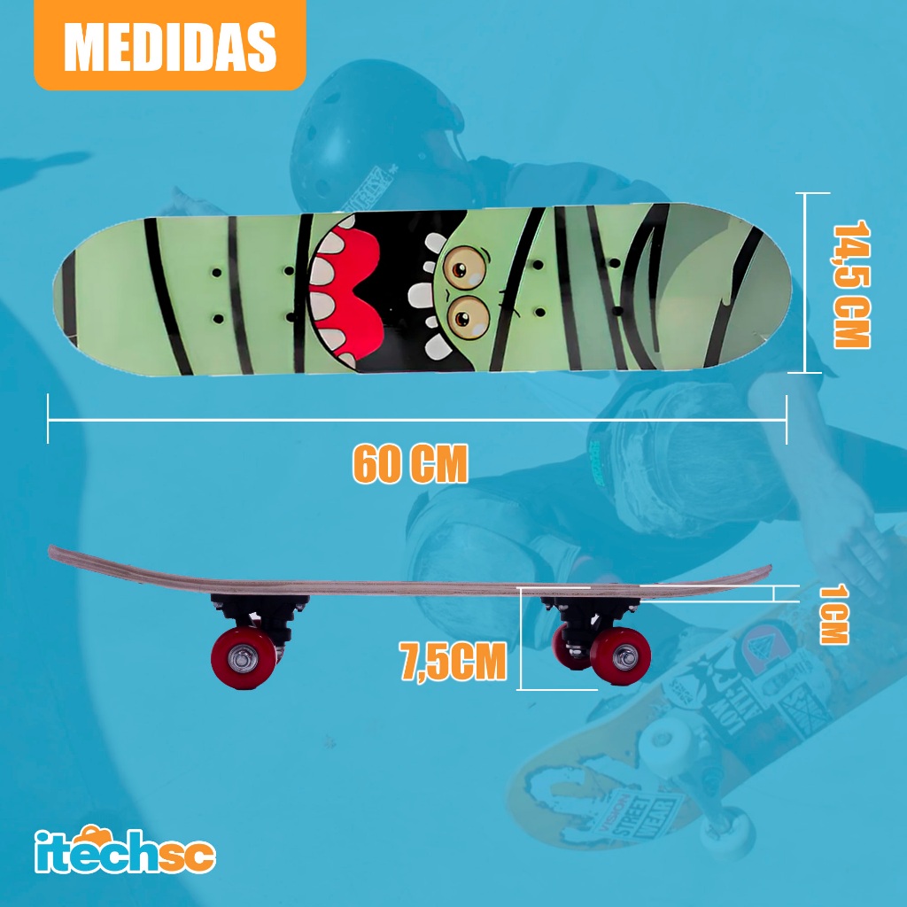 Skate Infantil Semi Profissional Montado Estampado 60cm 45kg
