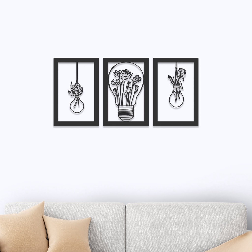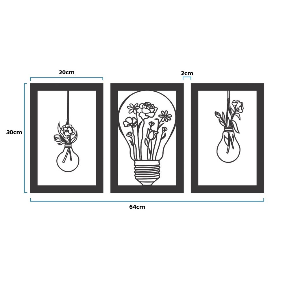 3 Quadros Decorativo Lâmpadas Florais MDF Preto Fosco