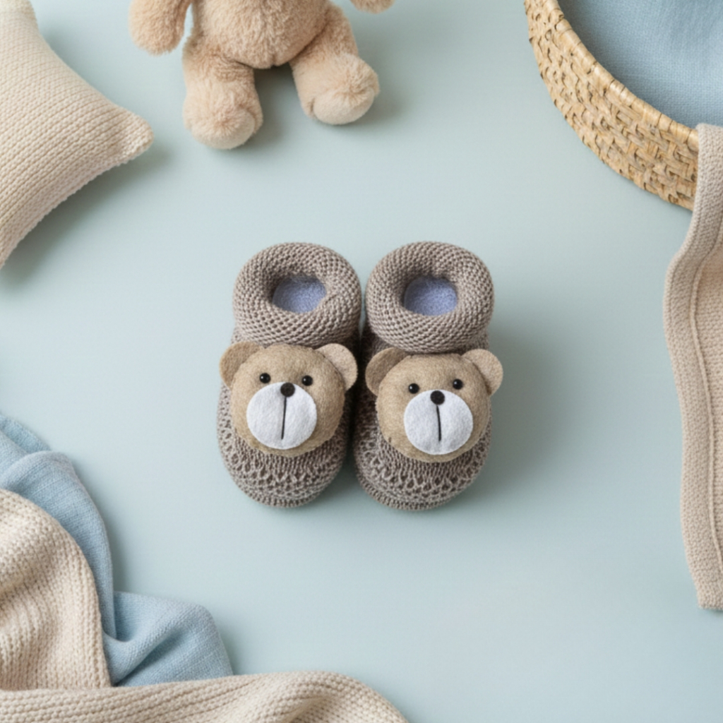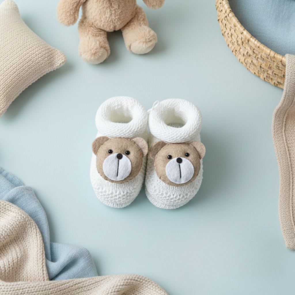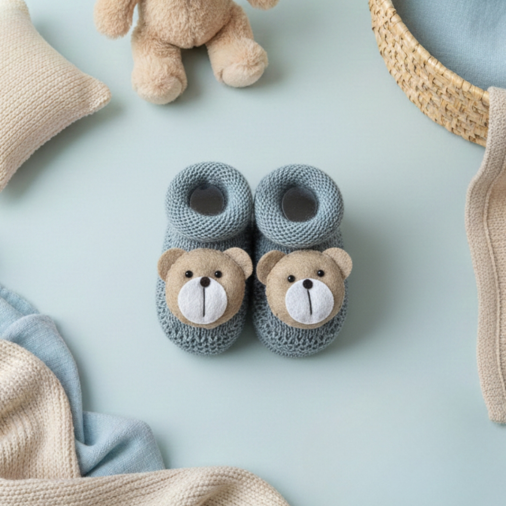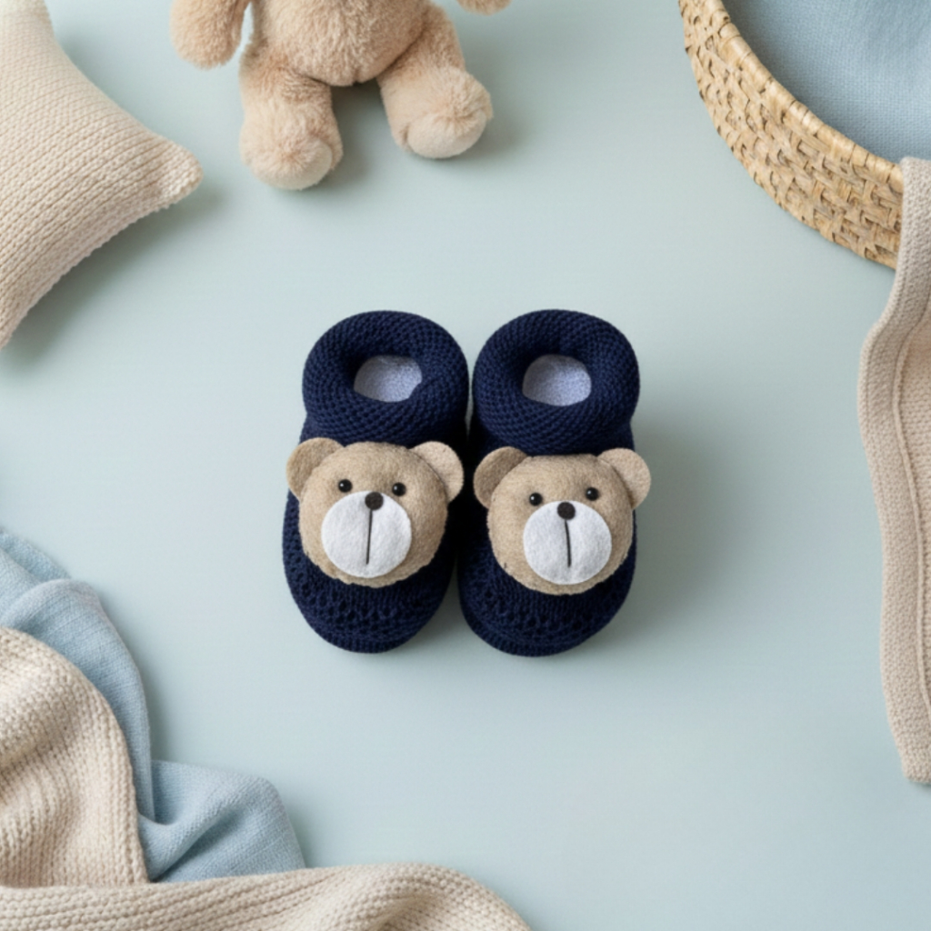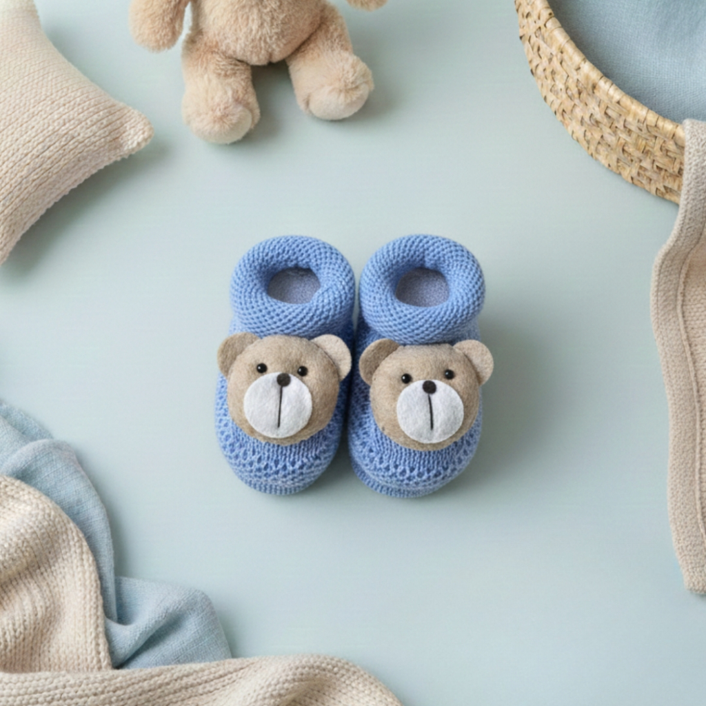 Sapatinho de Tricô Bebê Menino Recém-Nascido c/ Aplicação 3D Urso
