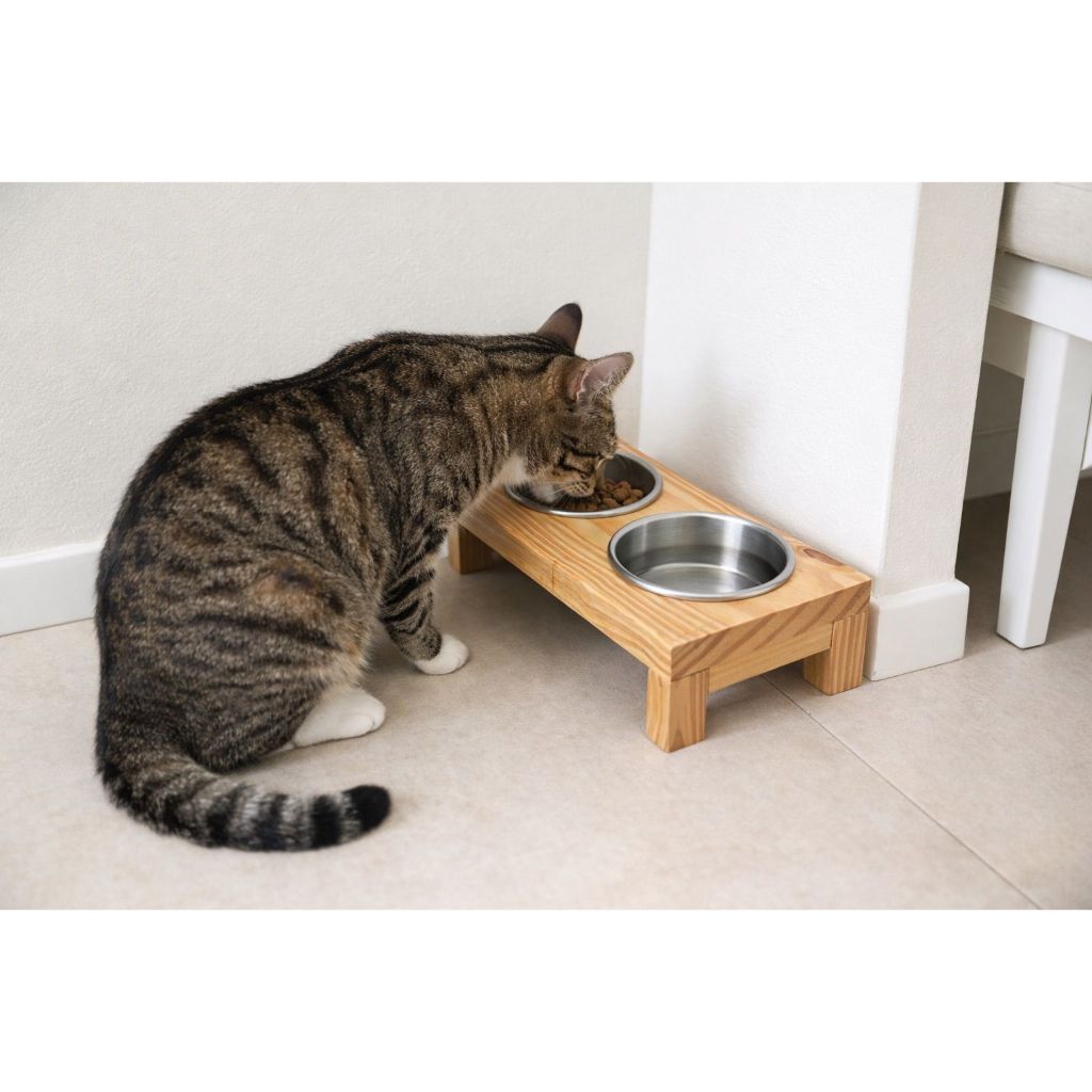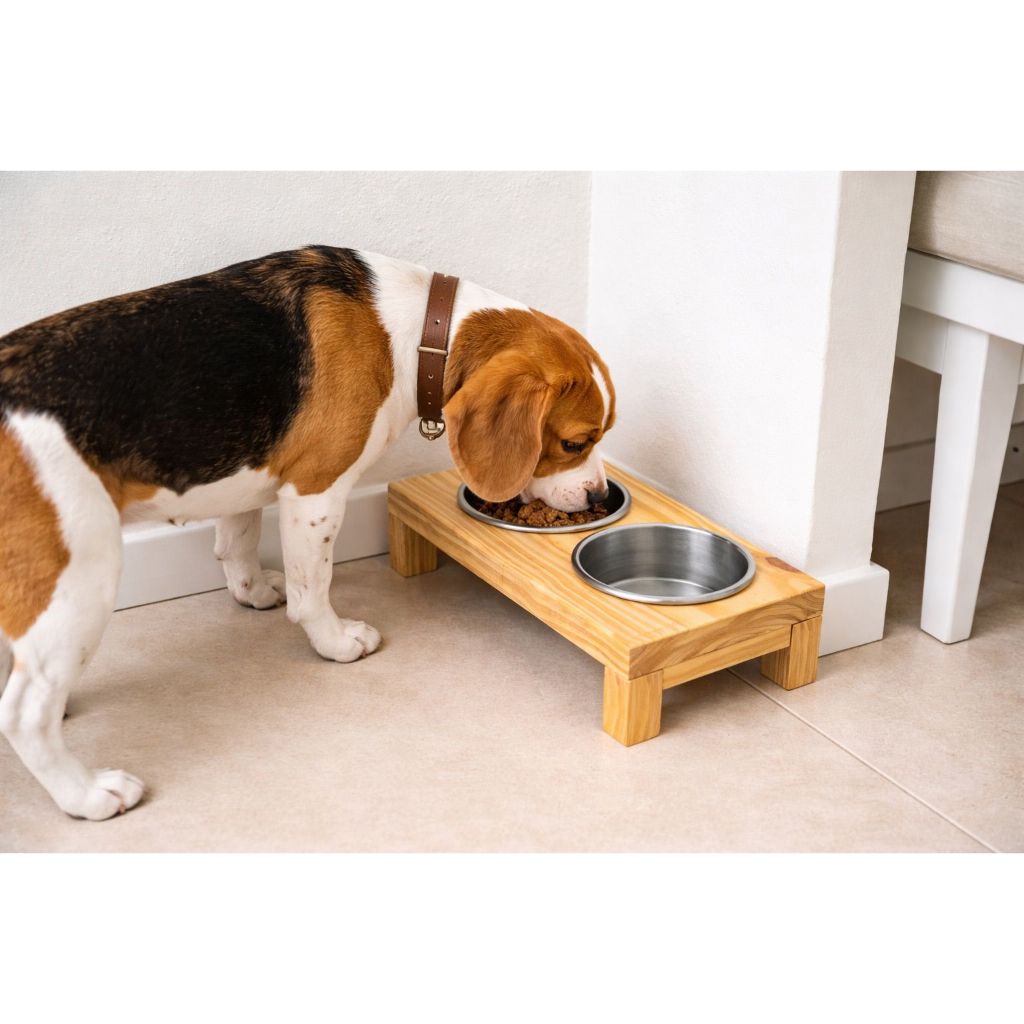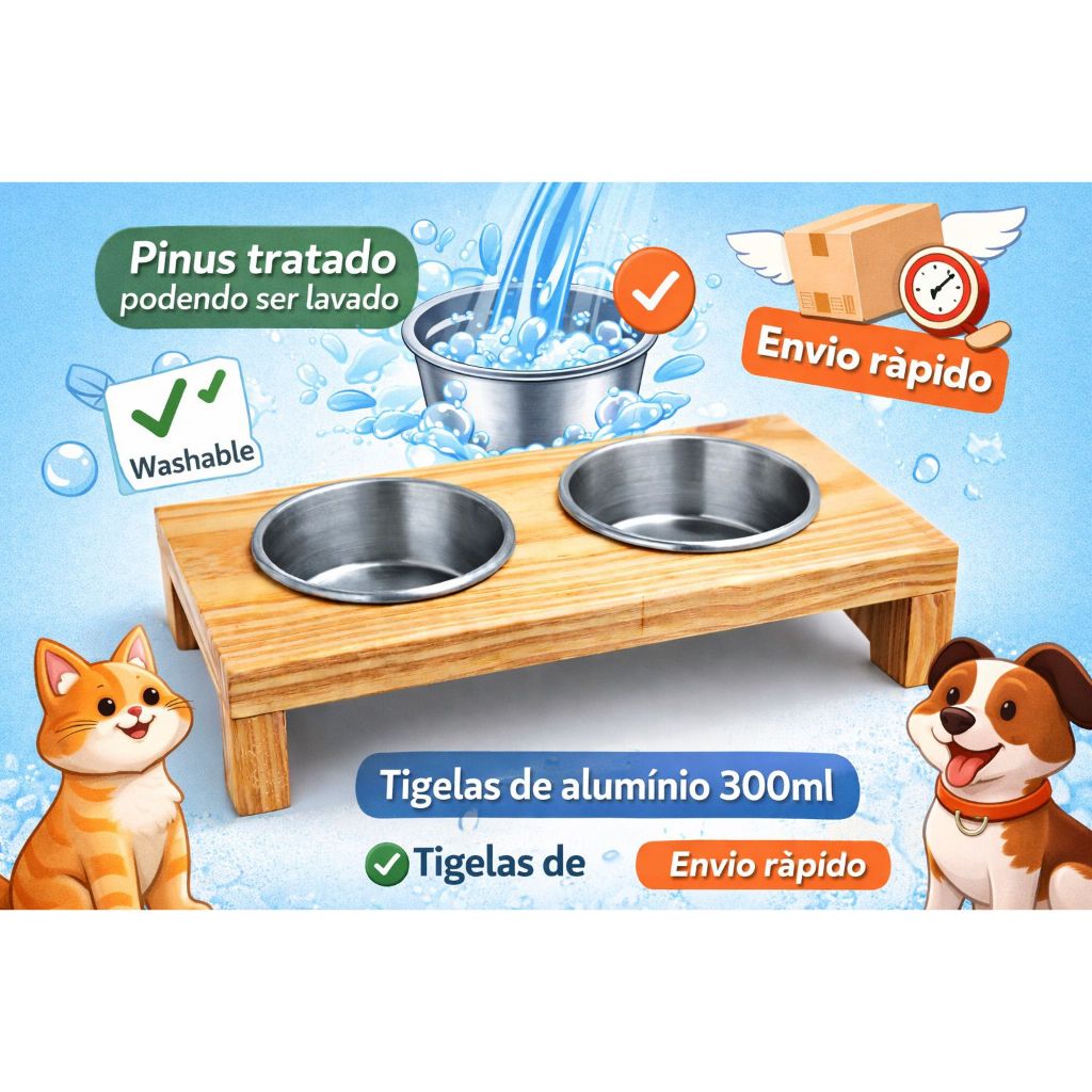 kit Comedouro Elevado Pet Madeira Pinus Tratada duplo Vasilhas Alumínio 300ml Lavável cachorro gato conjunto