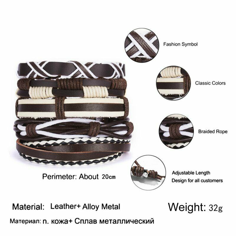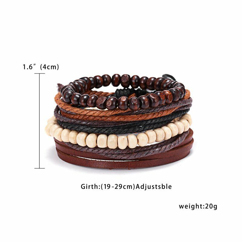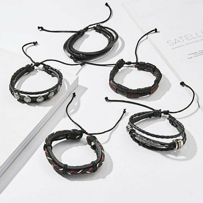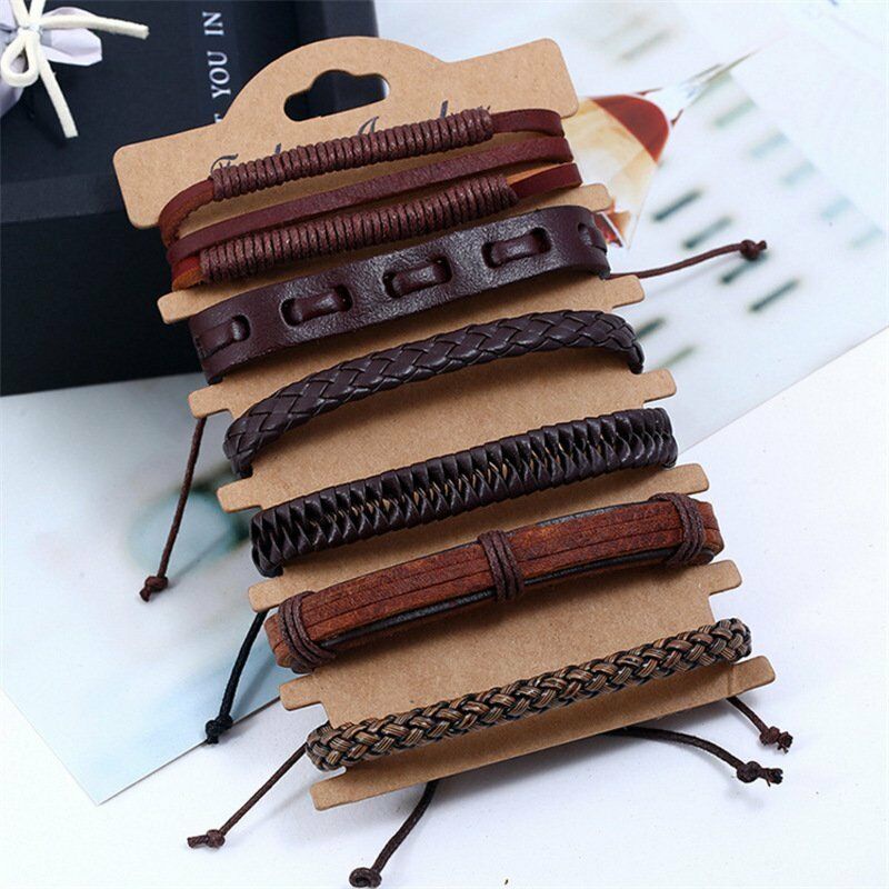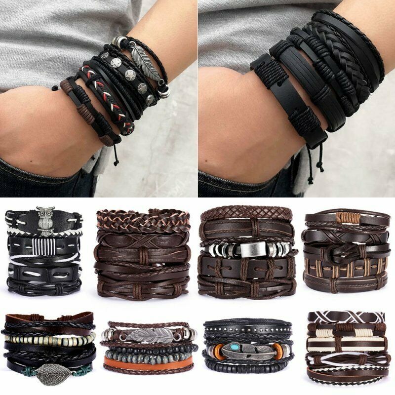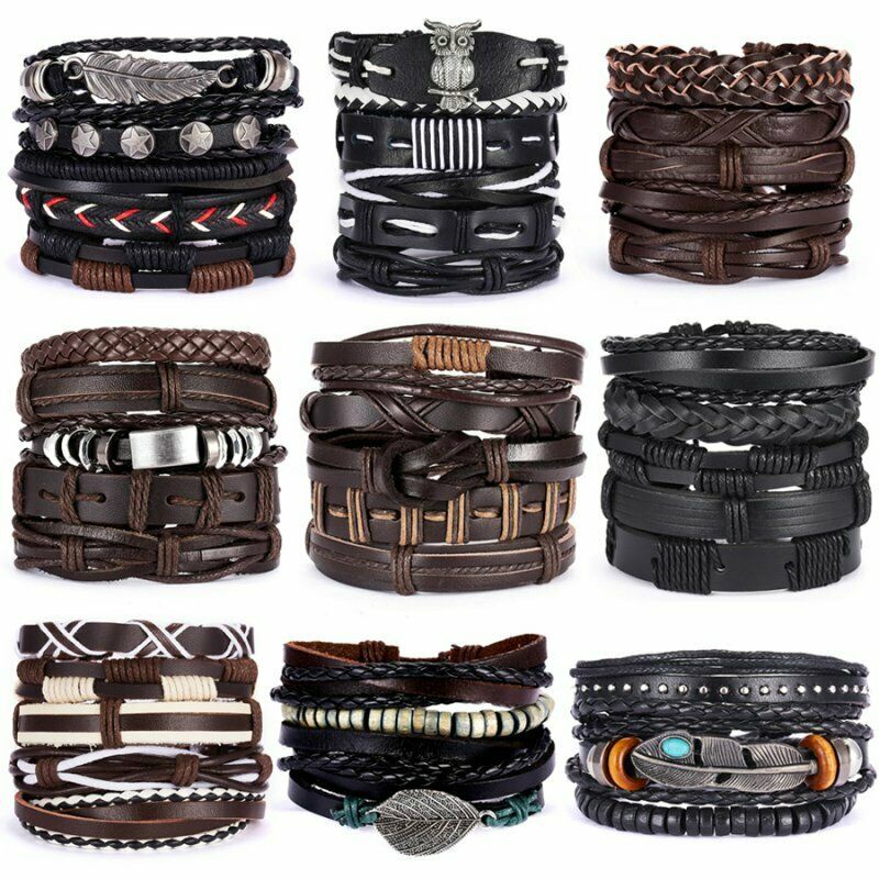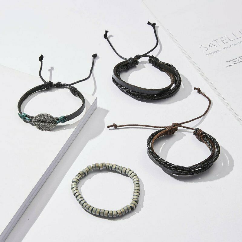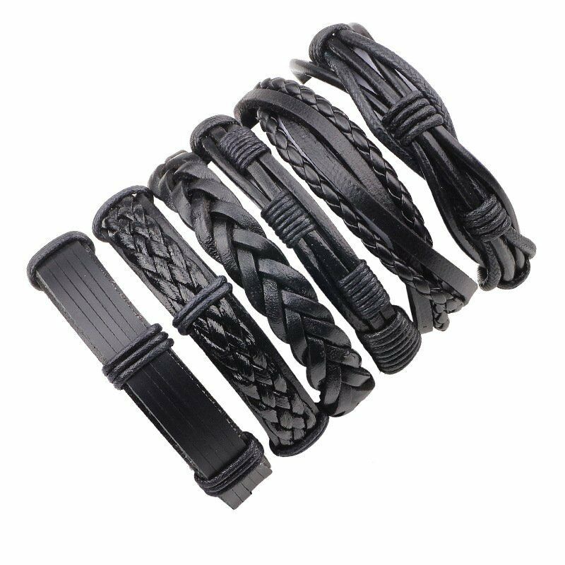 1/3/4/5/6pcs 1 Conjunto Pulseiras Combinadas Homens Punk Leather Beads Leaf Wrap Pulseira Trançado Bangle Atacado