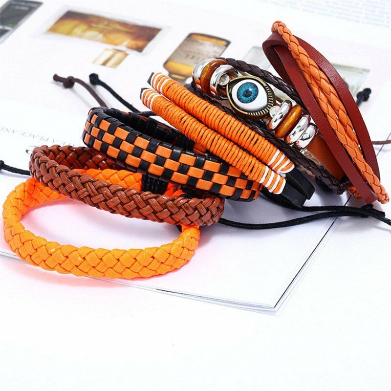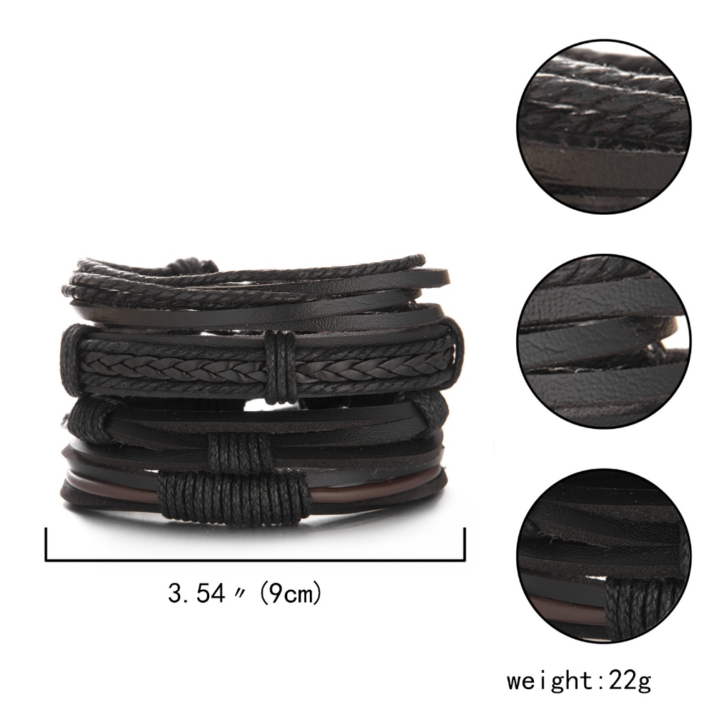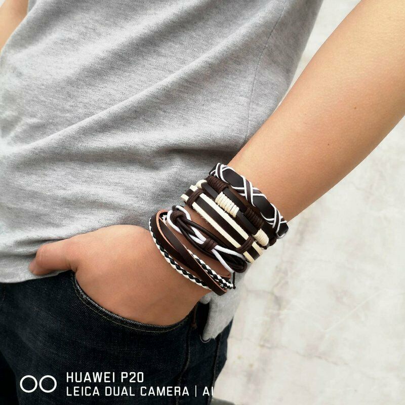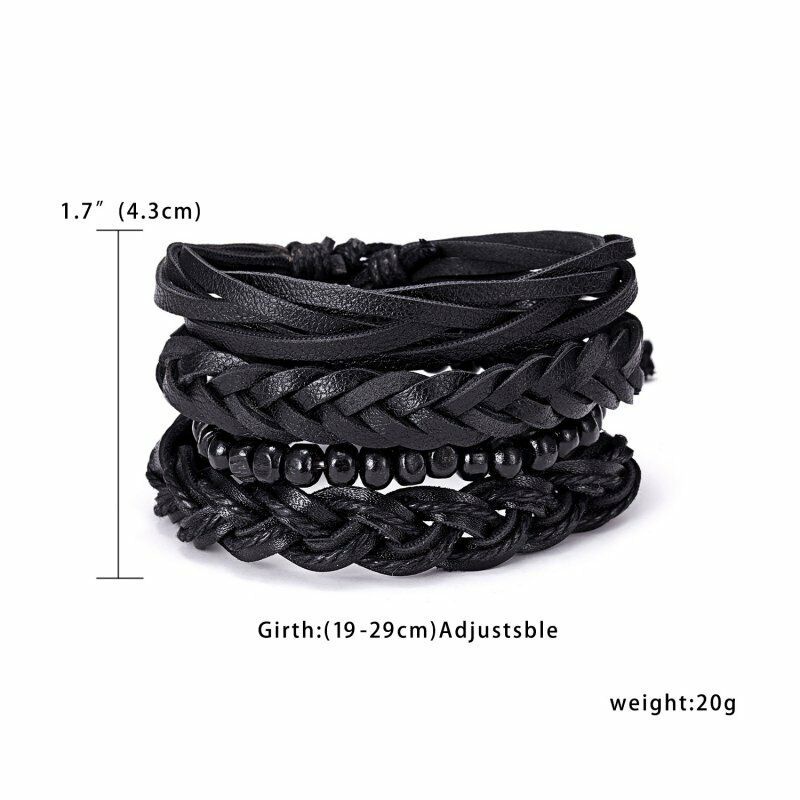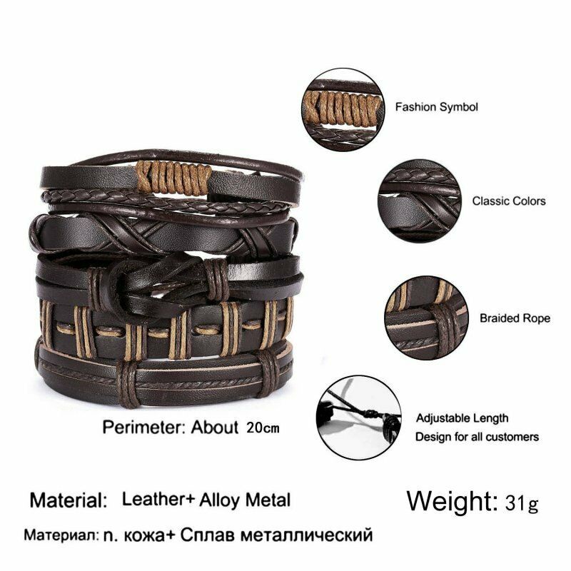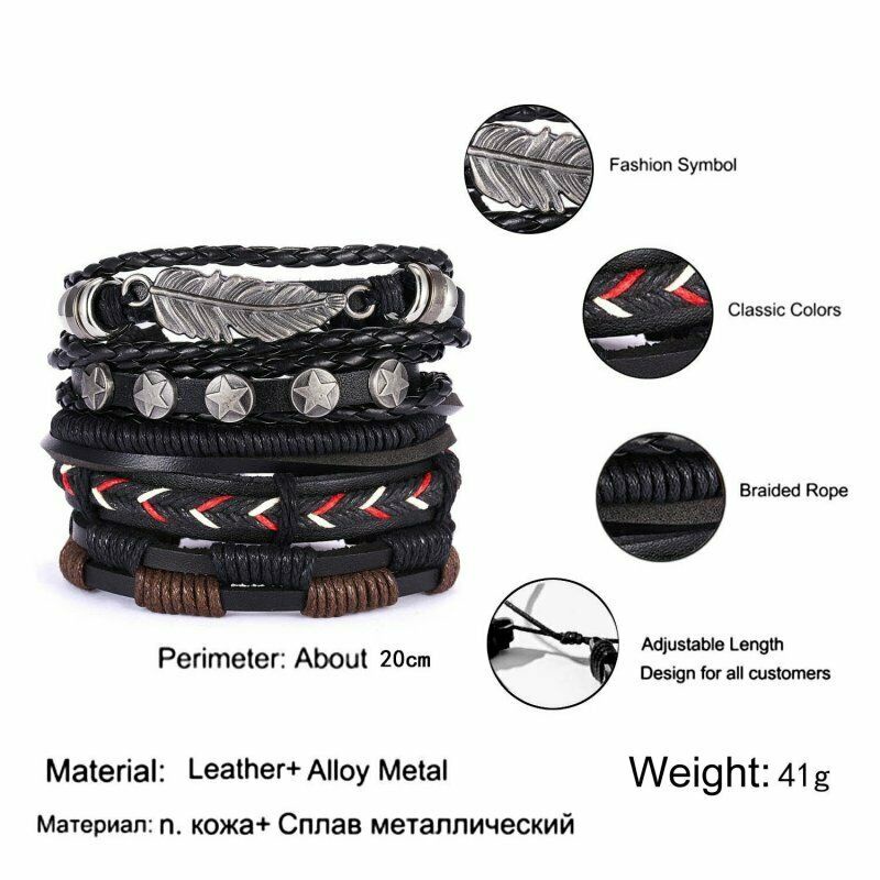 1/3/4/5/6pcs 1 Conjunto Pulseiras Combinadas Homens Punk Leather Beads Leaf Wrap Pulseira Trançado Bangle Atacado