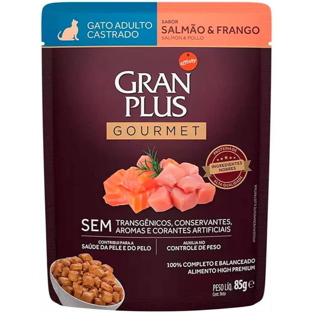Kit 5 Rações Úmidas Gran Plus Sachê Gatos Gourmet Castrados Salmão e Frango