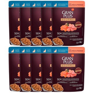 Kit 10 Rações Úmidas Gran Plus Sachê Gatos Gourmet Castrados Salmão e Frango 85g