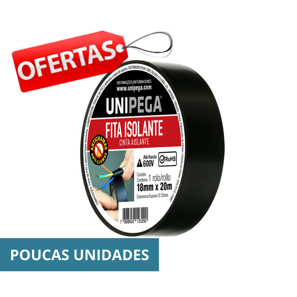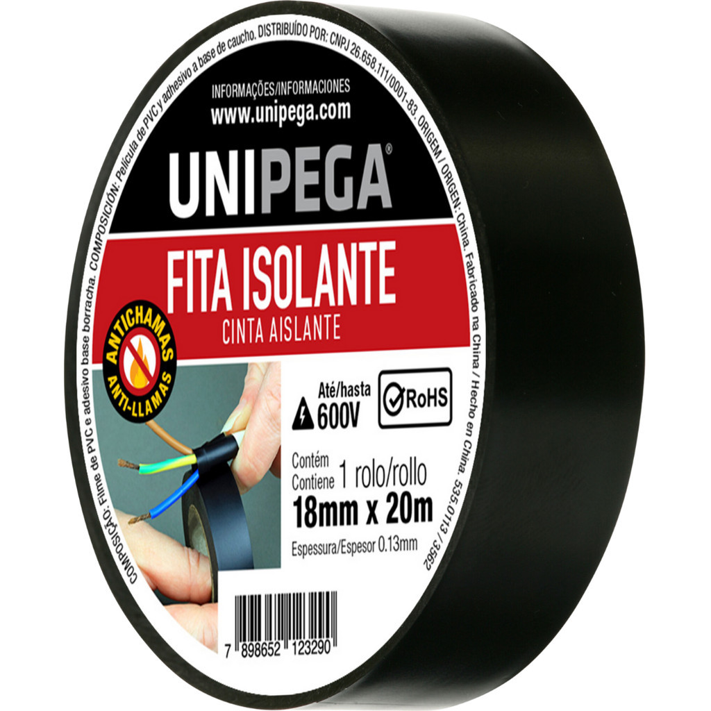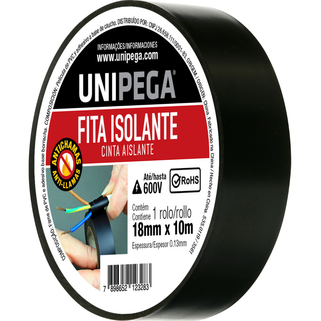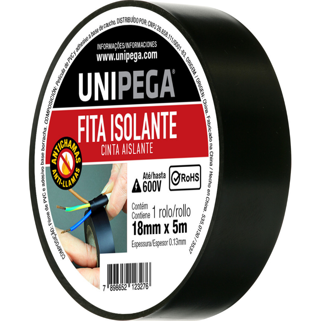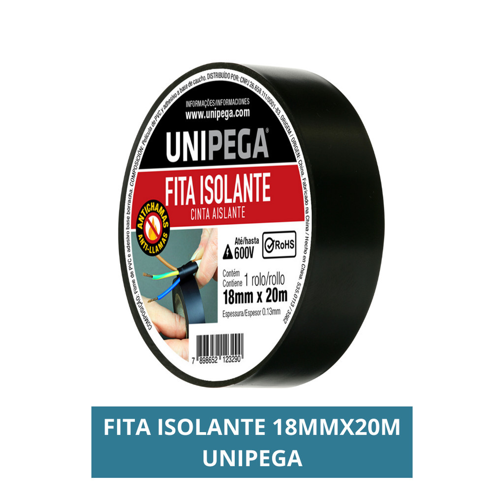 Fita Isolante Preta 18mm 5 Metros 10 Metros e 20 Metros Adesiva Fios Cabos Reparos Emendas Unipega