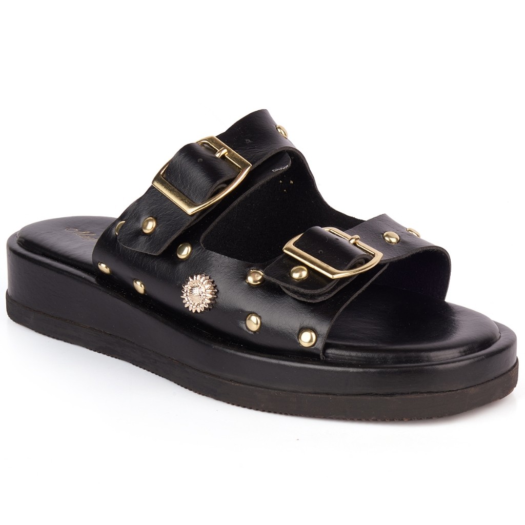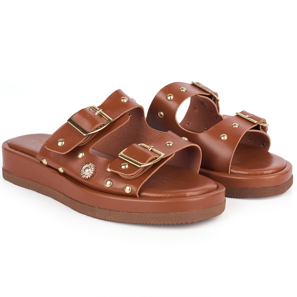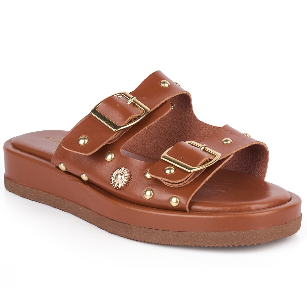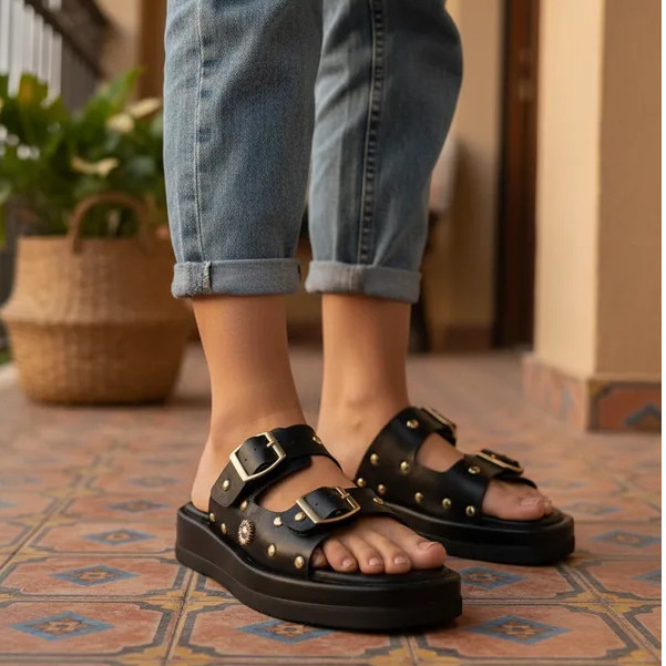 Sandália Papete Feminina Flatform Rasteira Confortável com Spike Ilhós Fivela