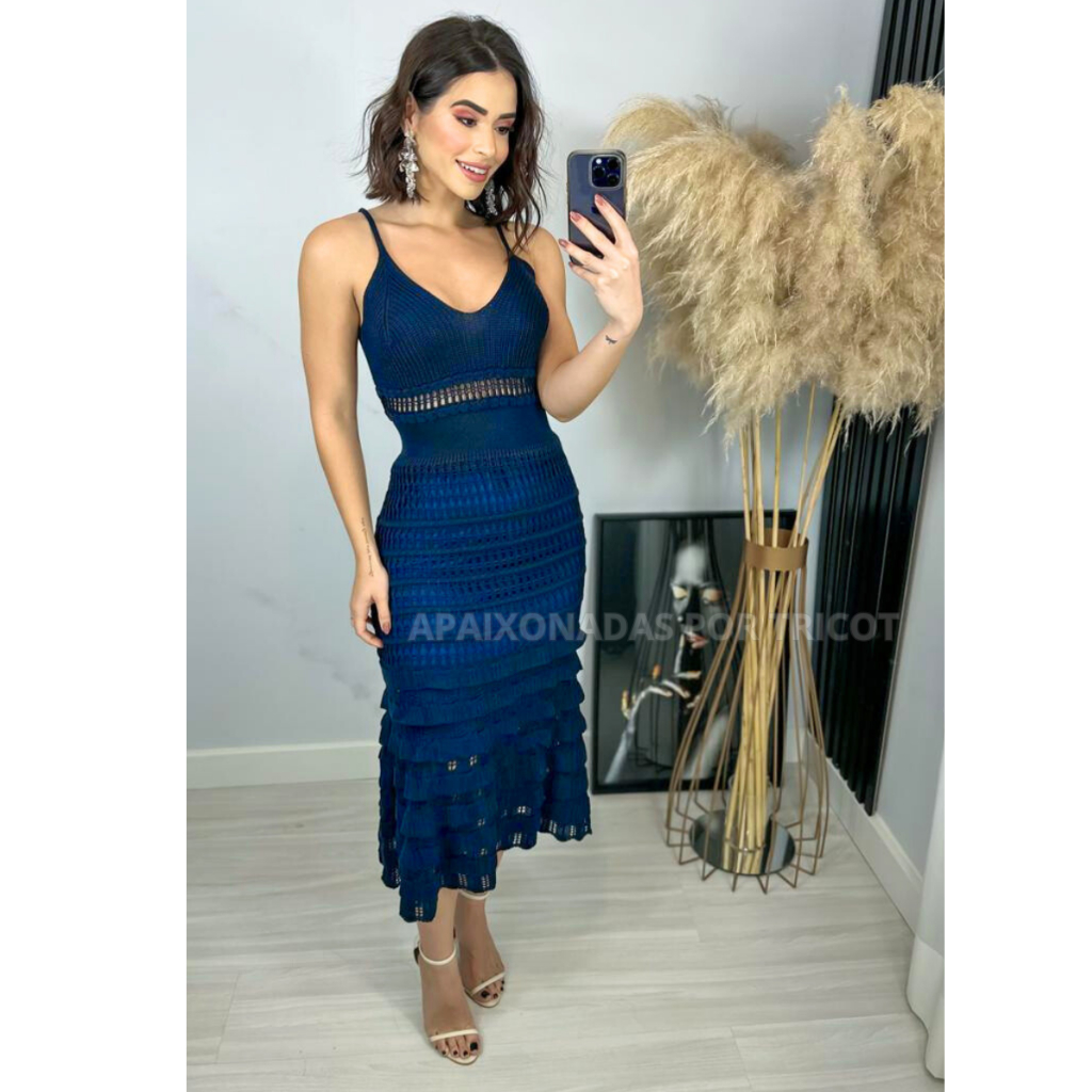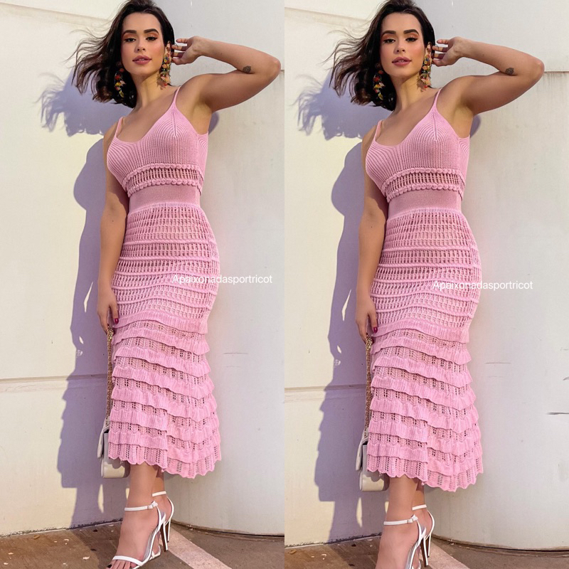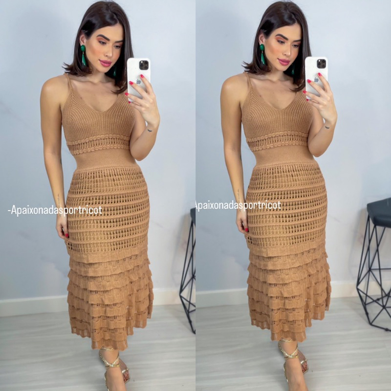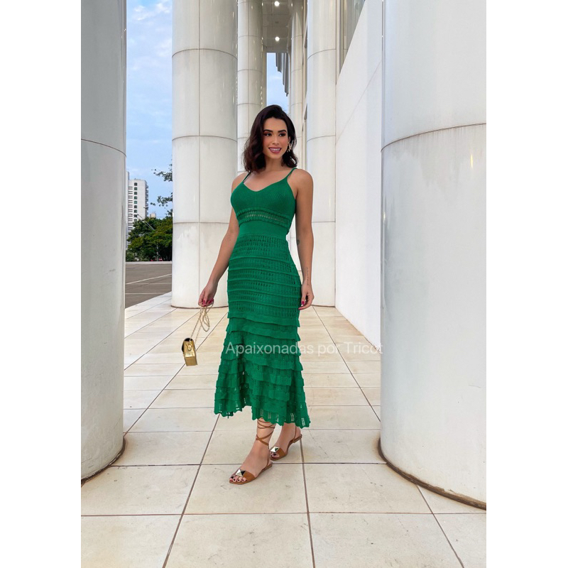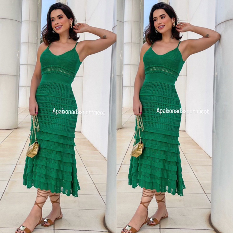 Vestido Babado Midi com forro Tricô Elegante Vestido tricot Vestido Tricô Vestido crochê Vestido Babados