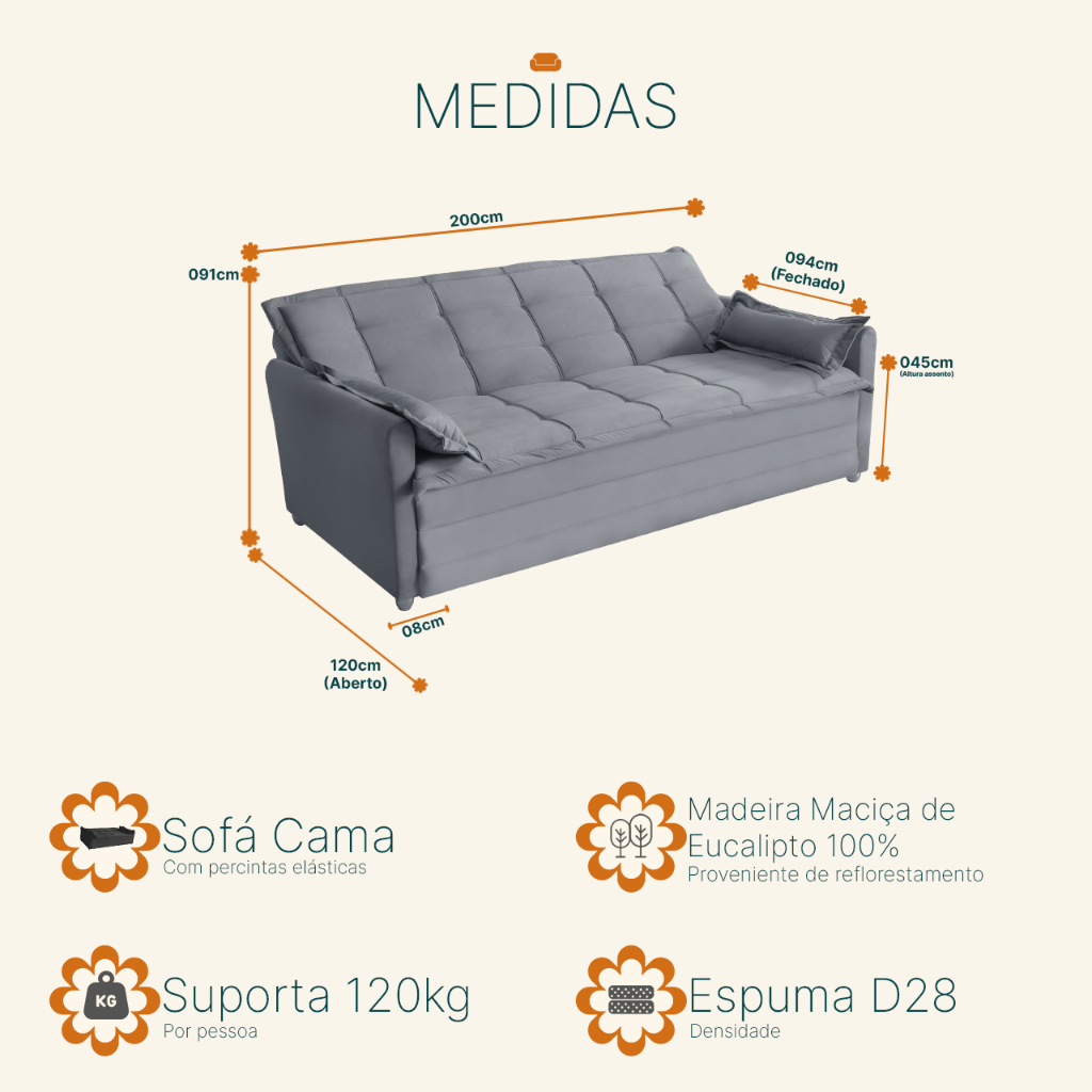 Sofá Cama Vienna 3 Lugares 2,00m Suede