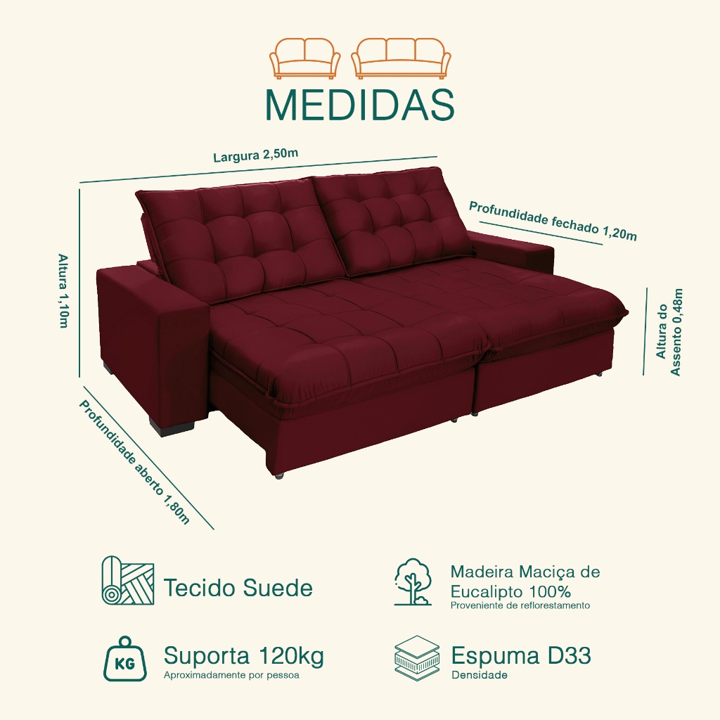 Sofá Retrátil E Reclinável 2,50m Suede Califórnia Suede Vinho