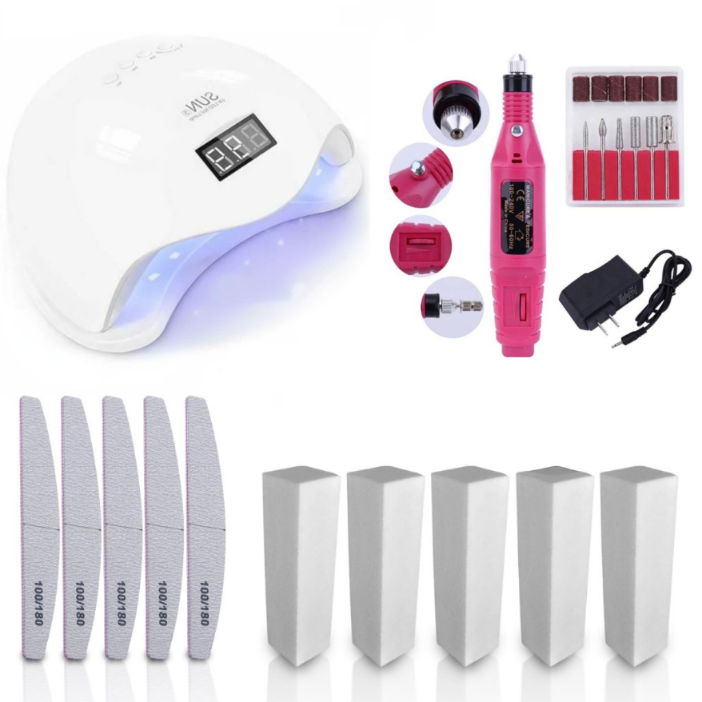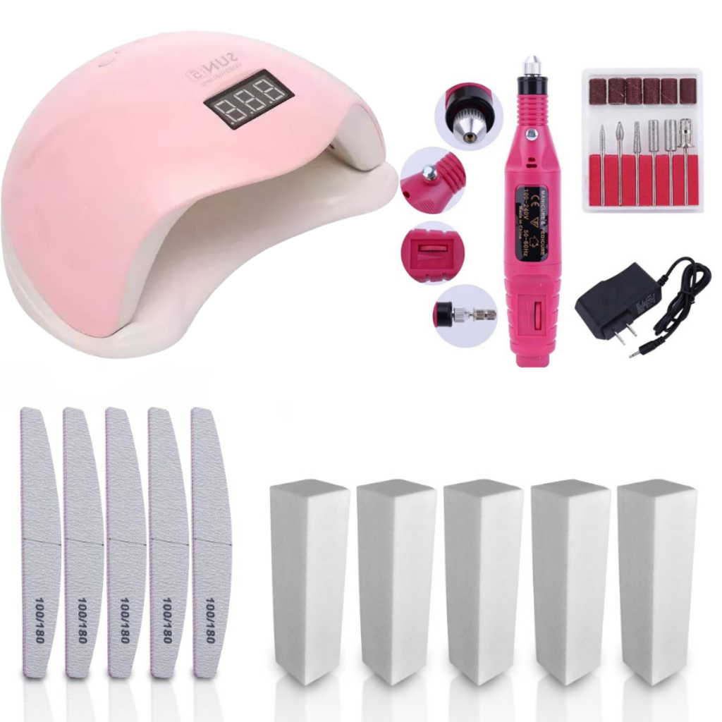 Kit Lixadeira Caneta, Cabine Sun 5, Lixa Bloco e Boomerang Alongamento, Nail Designer Profissional