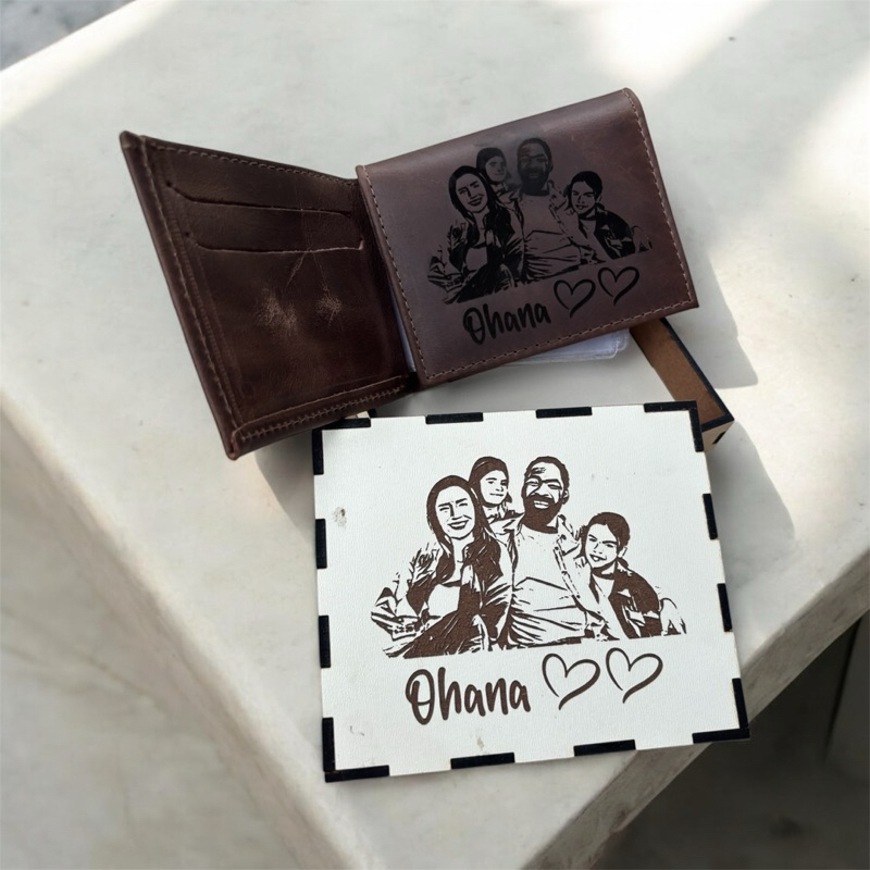 Carteira Personalizada em Couro Legítimo com Foto, Logo, nome ou Frase + Caixa MDF Personalizada