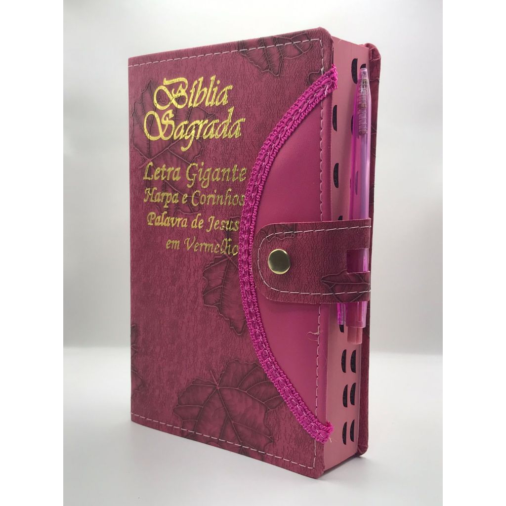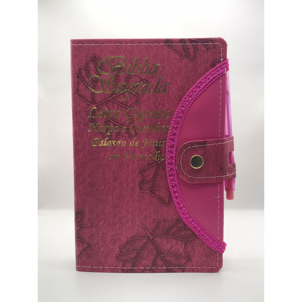 Bíblia Sagrada Tamanho Grande Palavras de Jesus em Vermelho com Harpa Botão Folha Pink