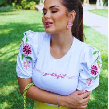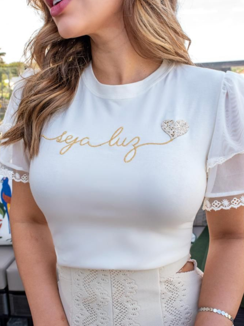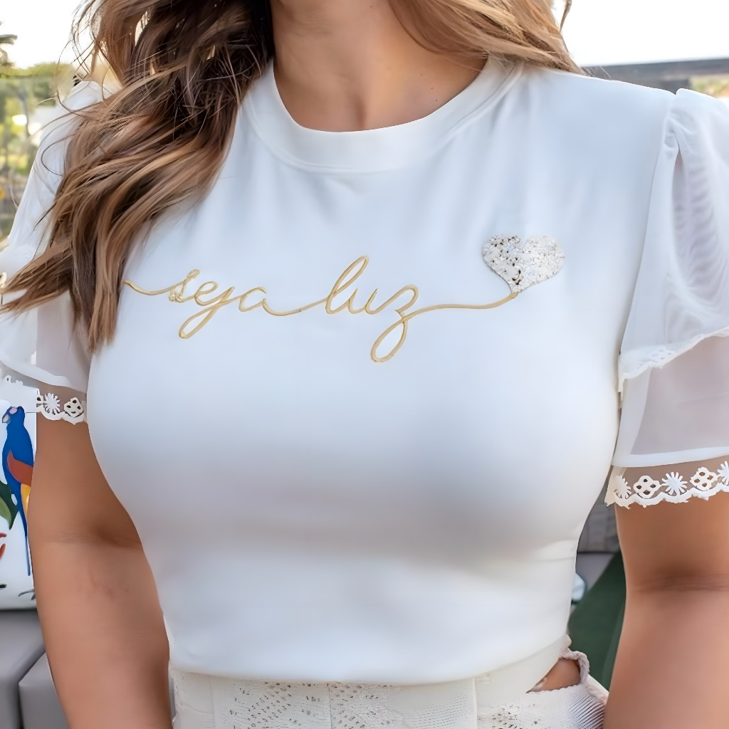 Blusa Feminina Elegante Preta Manga Bufante Bordada T-Shirt de Luxo 100% Algodão