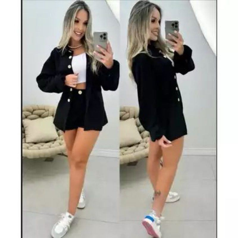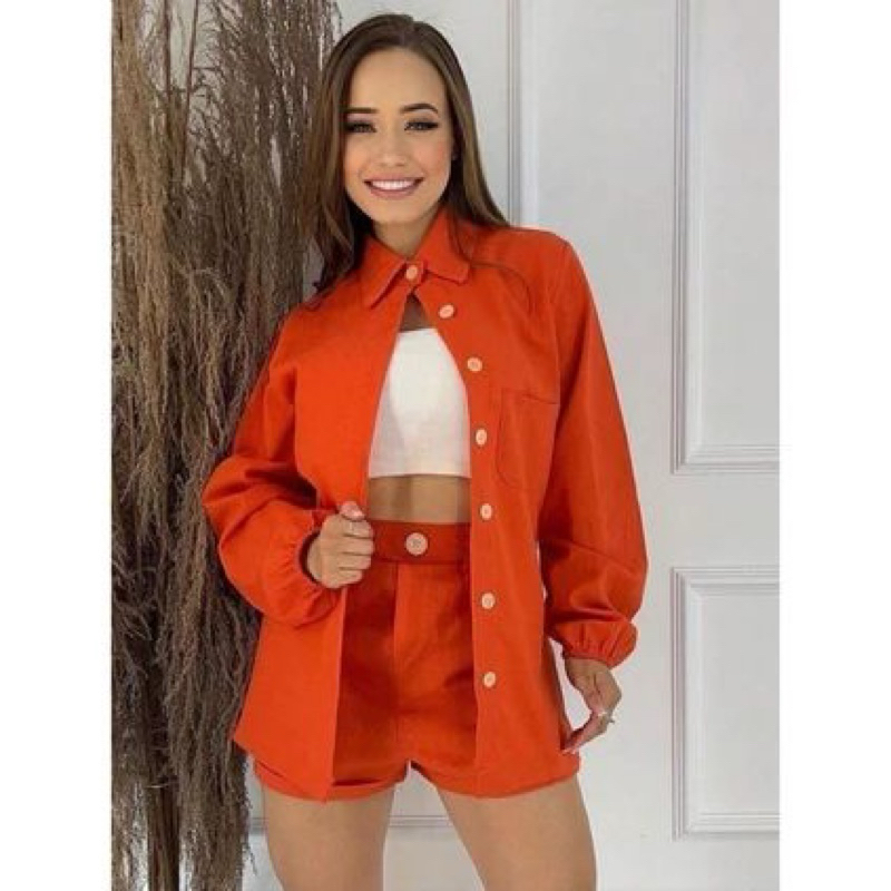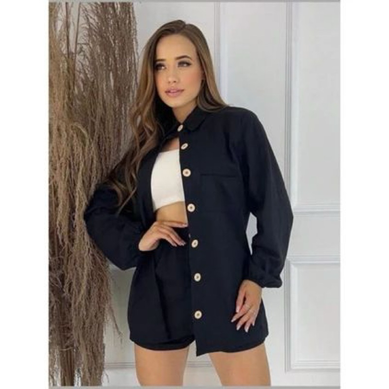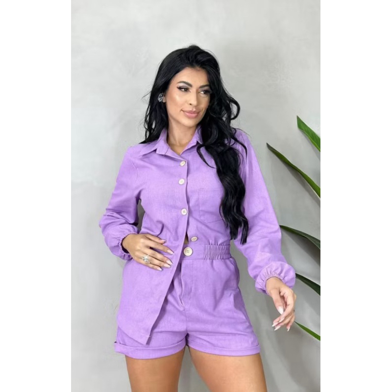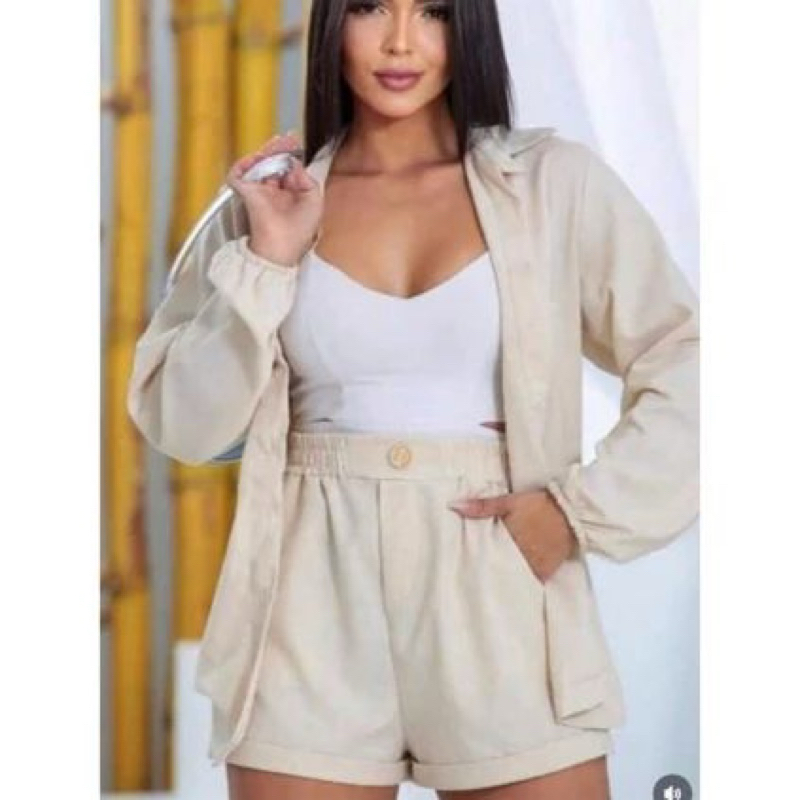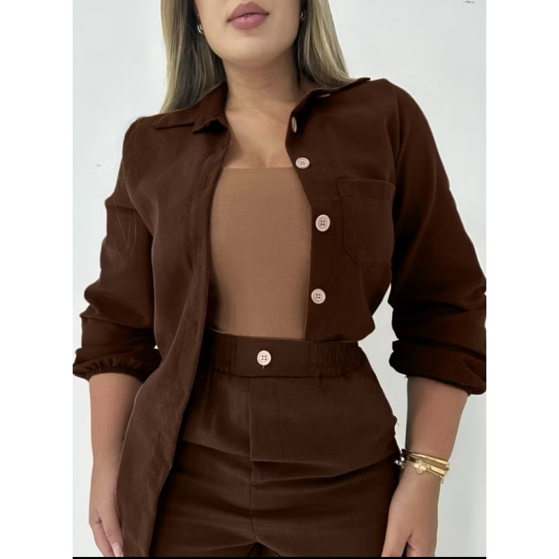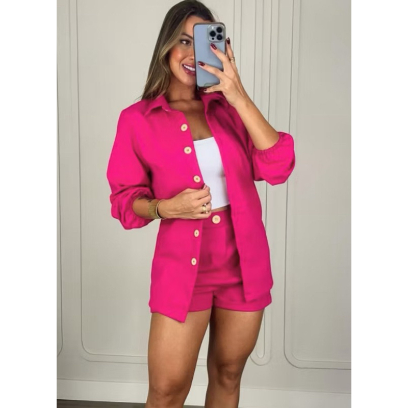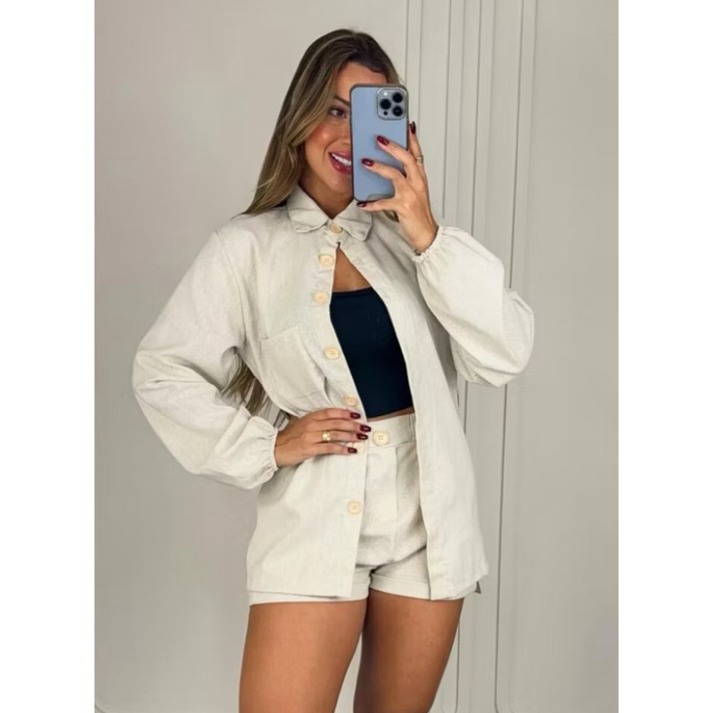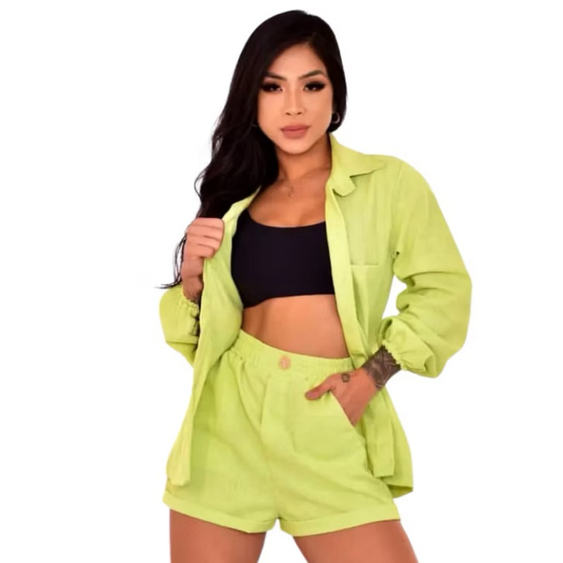 Conjunto Linho Camisa manga longa botões e short casual, colarinho inverno frio blazer Pastel