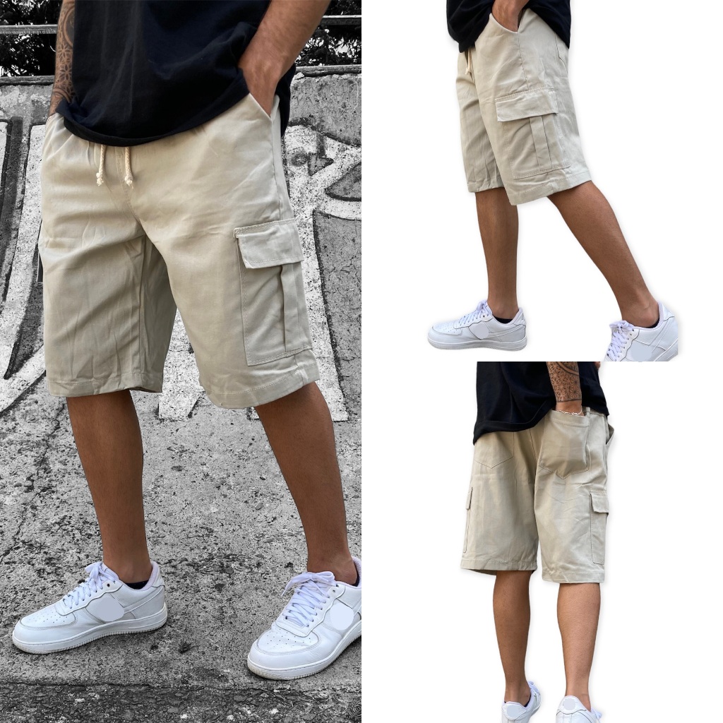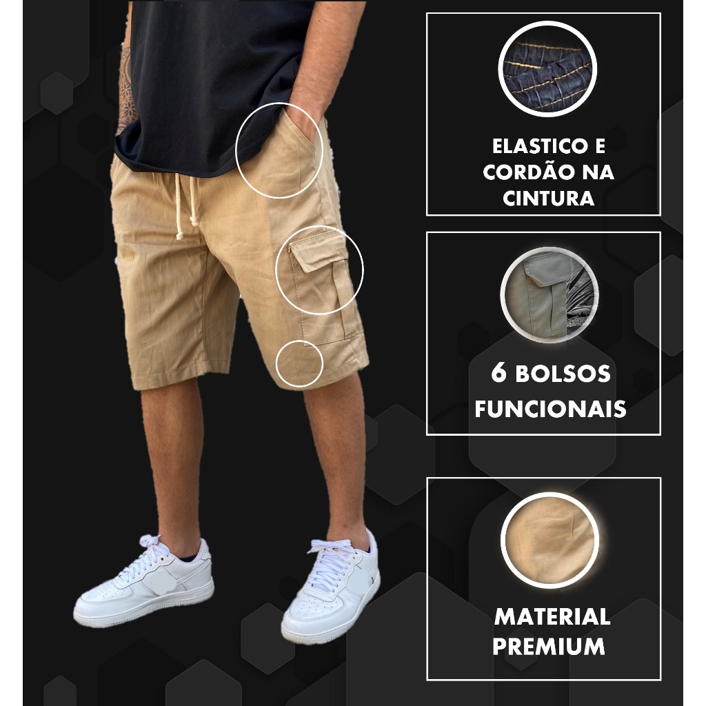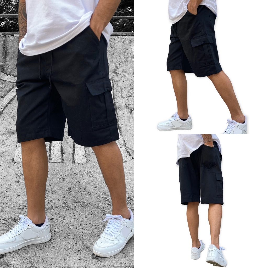Bermuda Cargo Larga Short Masculino Skate Plus Size 6 Bolsos Preta Elástico