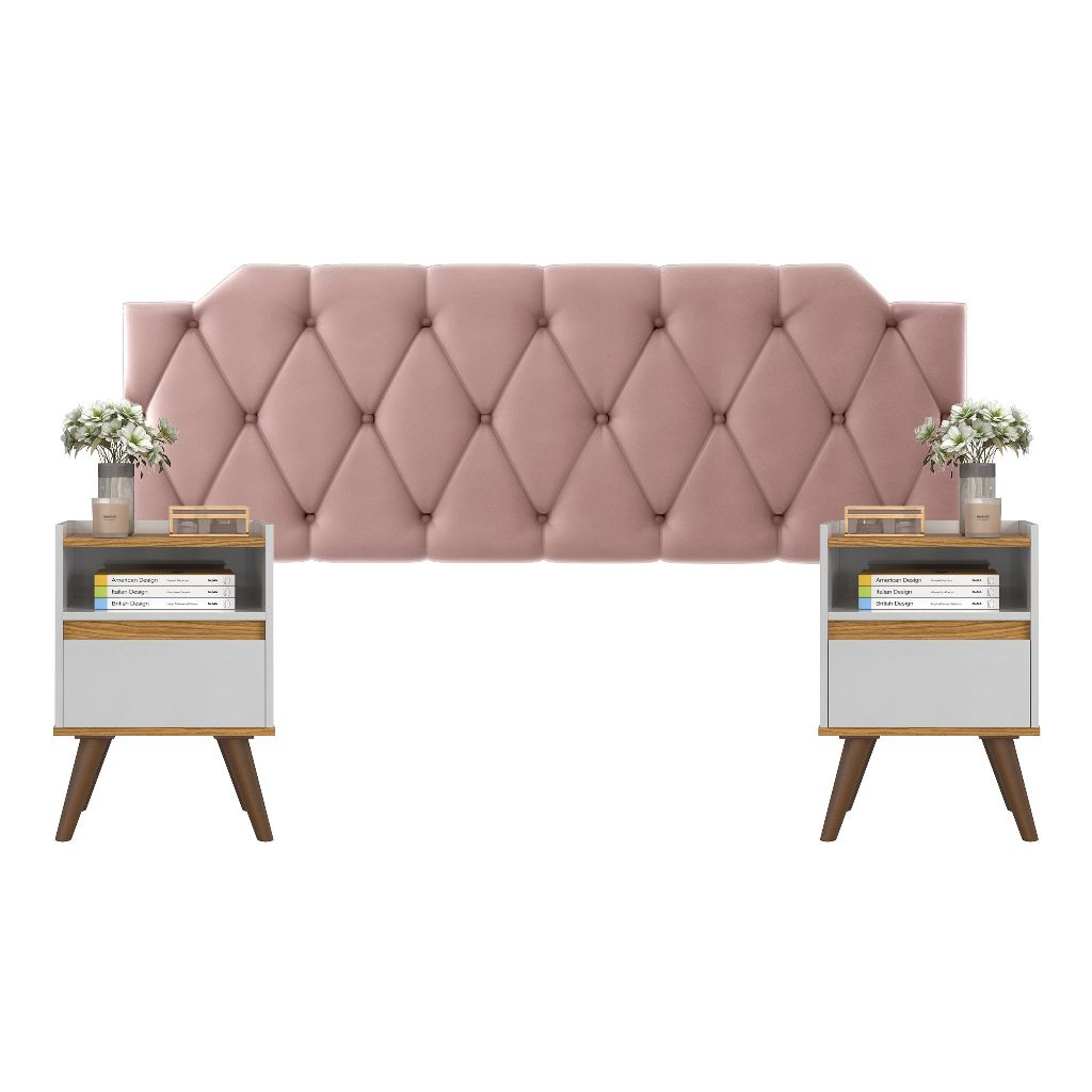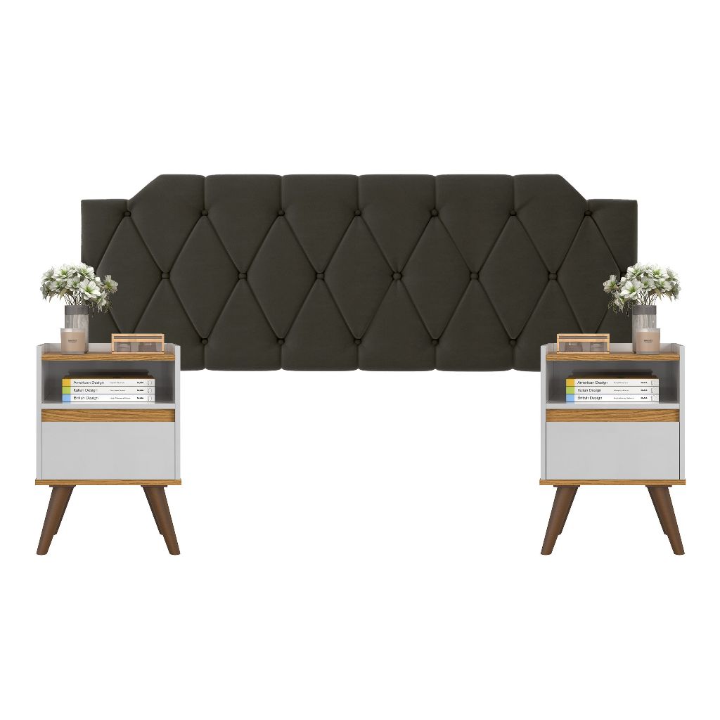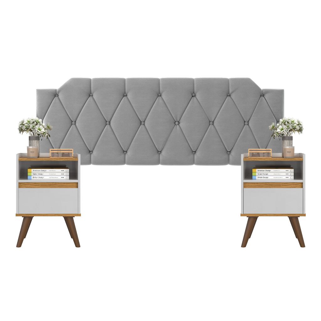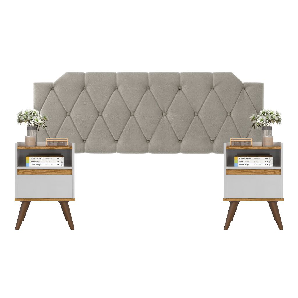 Conjunto Mesa De Cab Com Gaveta + Cabeceira Estofada Box Para Cama Queen