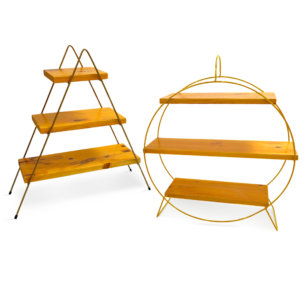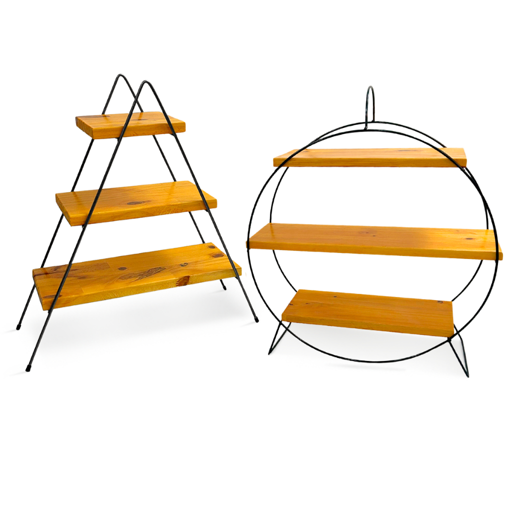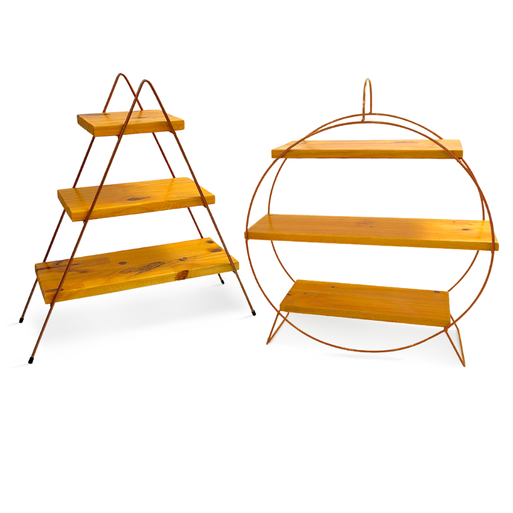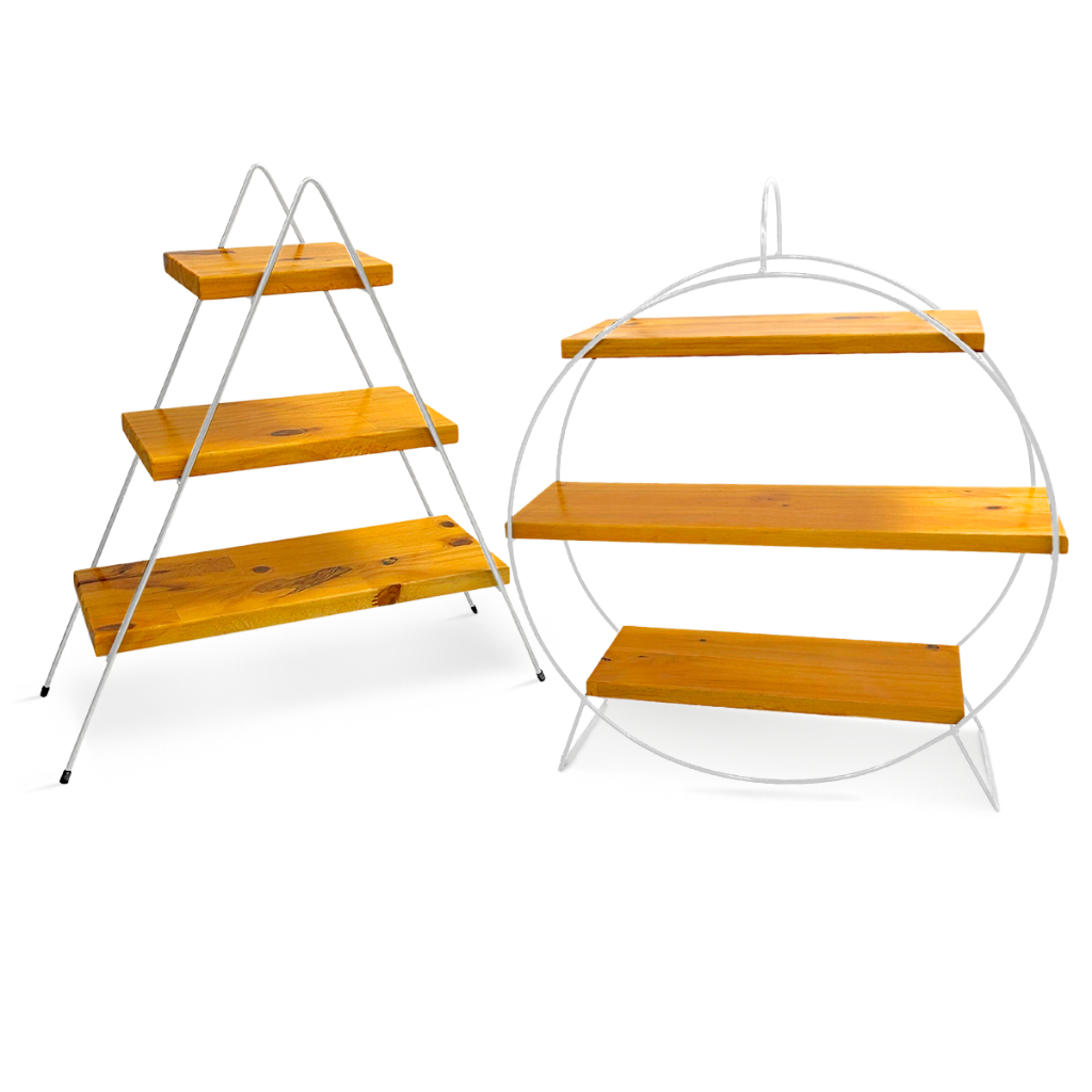 Kit 2 Prateleiras Escadinha e Redonda Roda Gigante Decorativa Suporte Doces Ferro Madeira