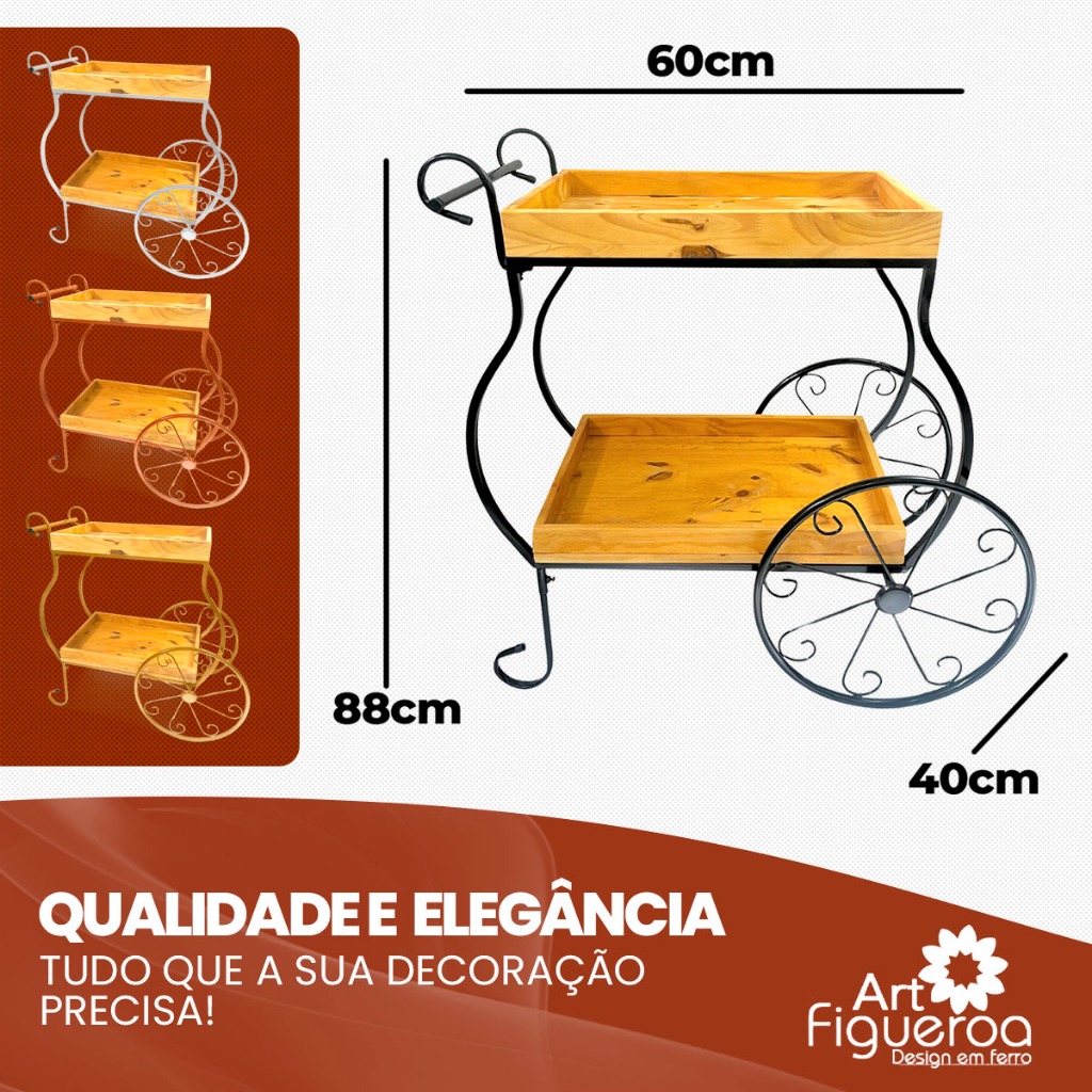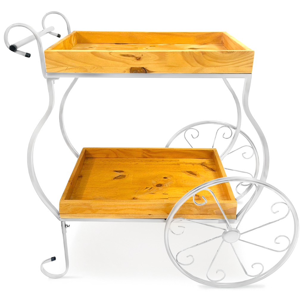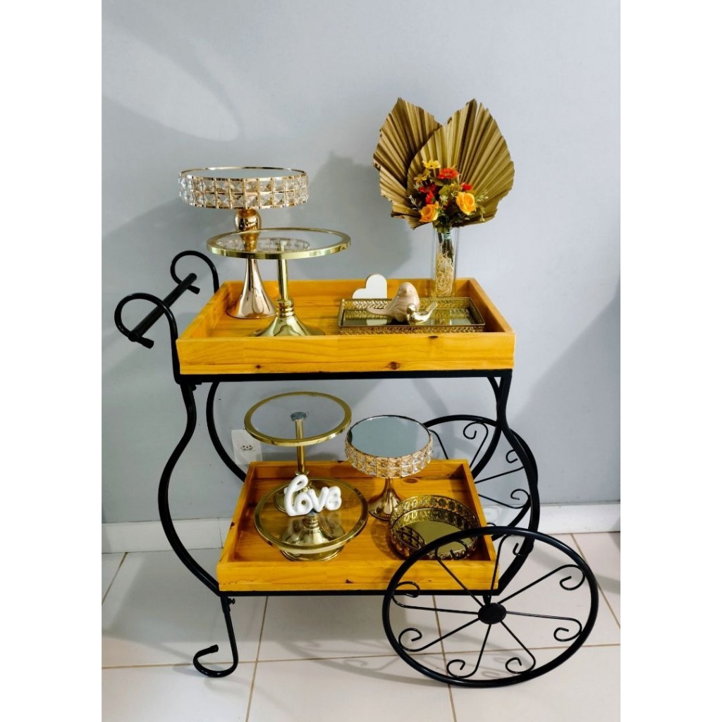 Carrinho de Chá Elegante Com Borda Artesanal Madeira e Ferro p/ Decoração Buffet Festas e Casamentos