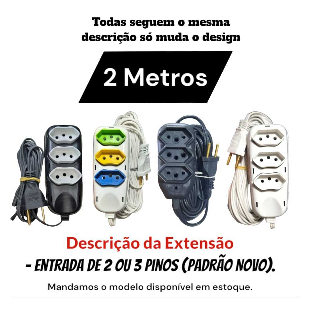 Extensão Elétrica 2 3 5 e 10 Metros Extensão de Energia de 3 Tomadas 2 P+T 10 amperes