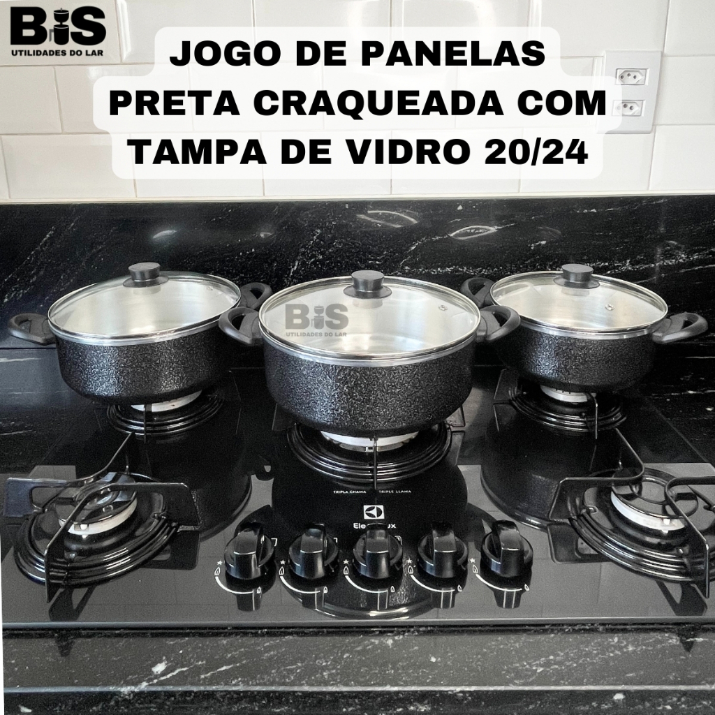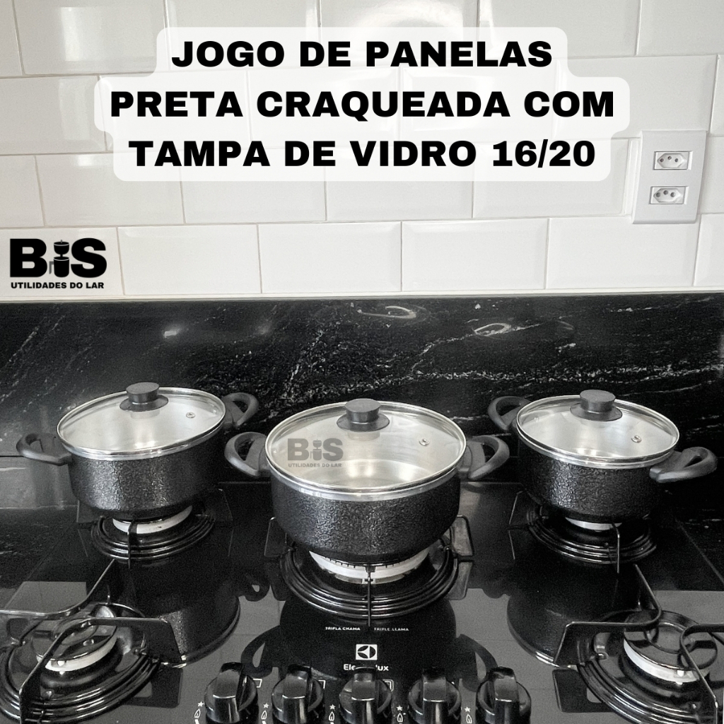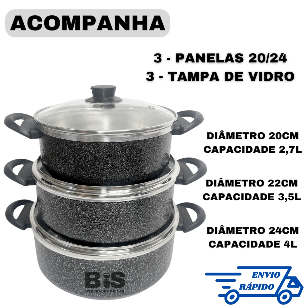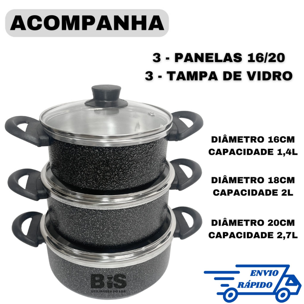 Jogo de Panela com Tampa de Vidro 3 Peças Conjunto Kit Caçarola N16-18-20 Ou 20-22-24
