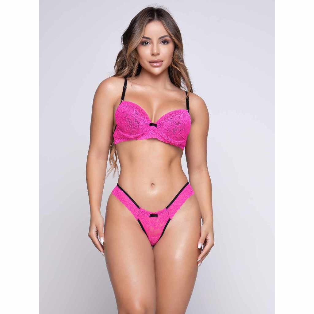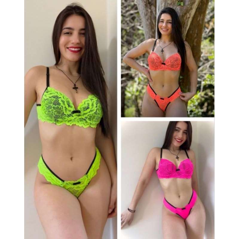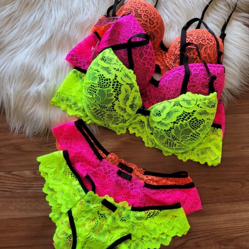 kit com 3 conjuntos de lingerie com renda neon langerie com bojo