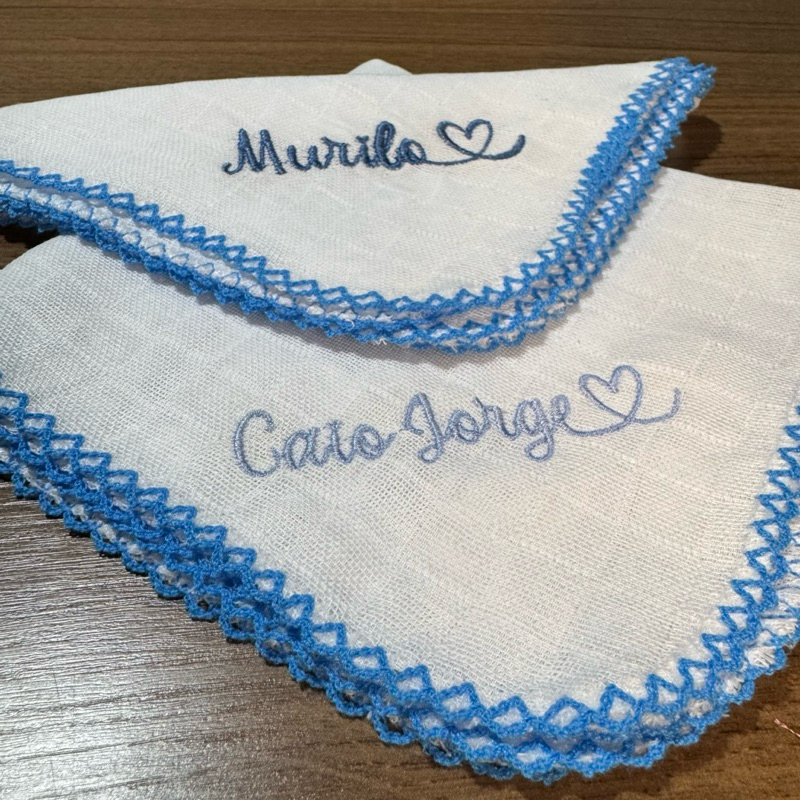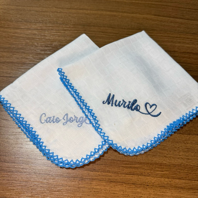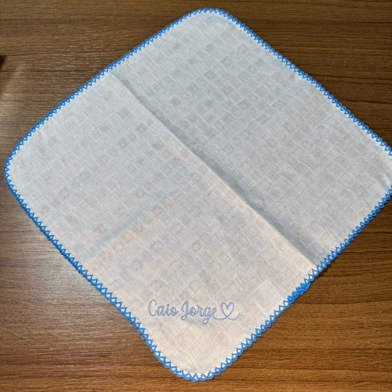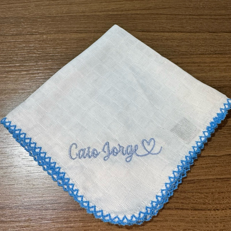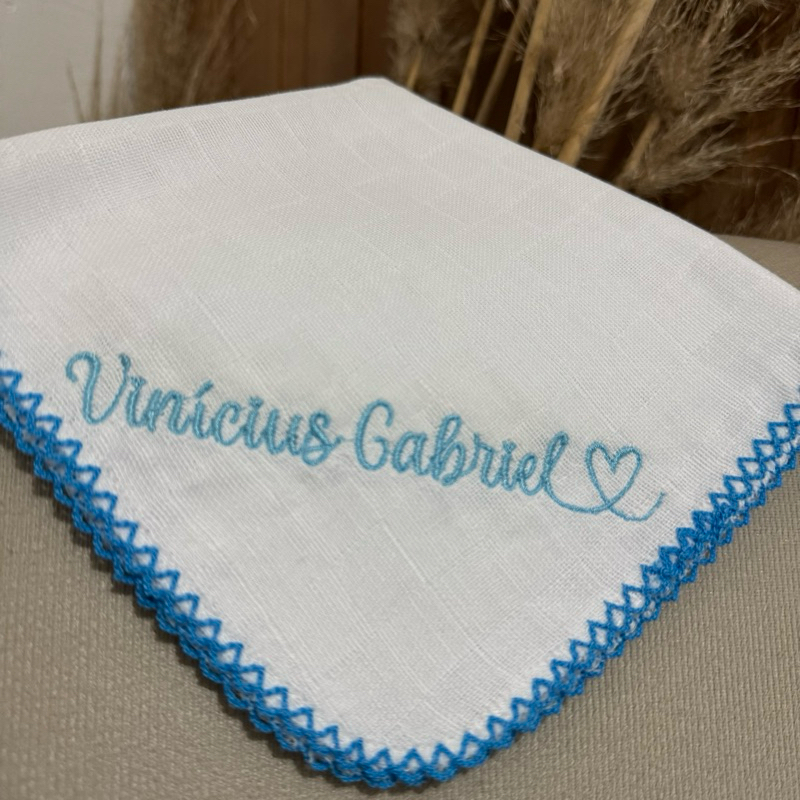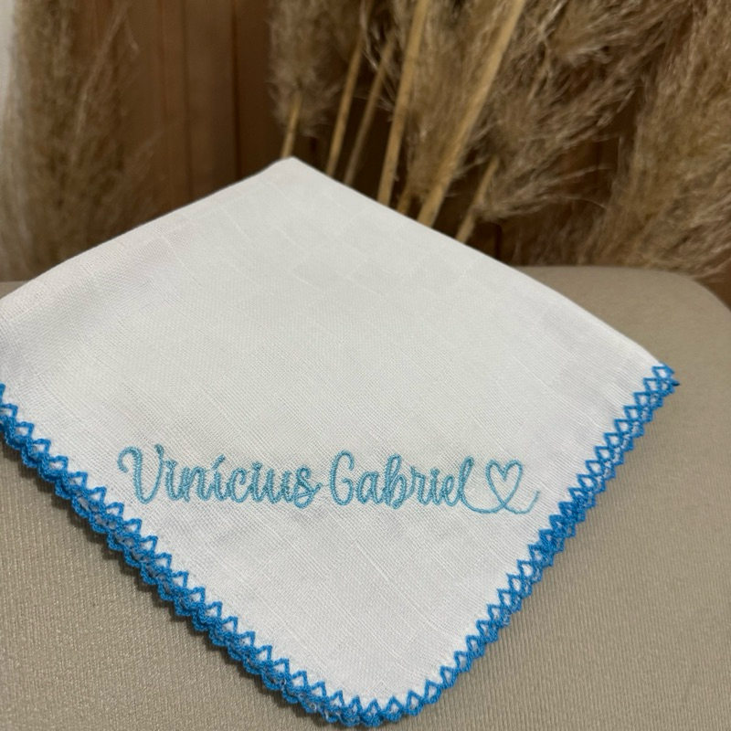 Fralda de Boca Quadriculada com Nome Bordado – 33x33cm, 100% Algodão e Acabamento em Crochê