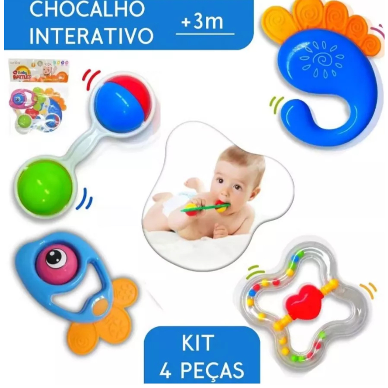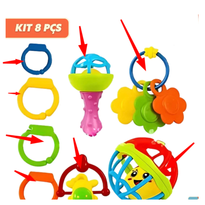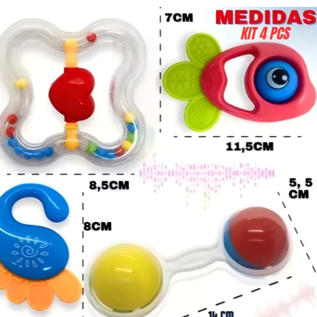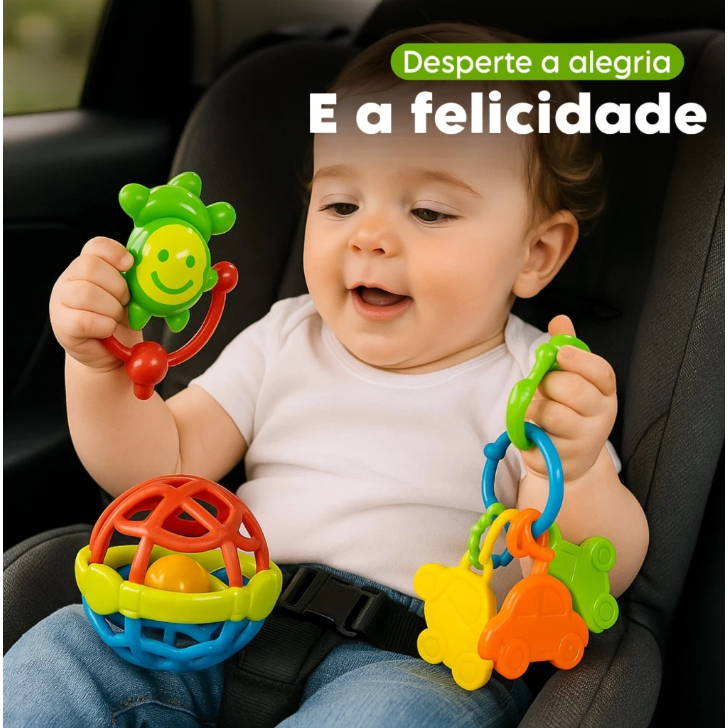 Kit 8 peças Mordedor para Bebe Sensorial Macio com Chocalho - Kit 4 mordedores ou Bolinha Mordedor Silicone Baby Ball