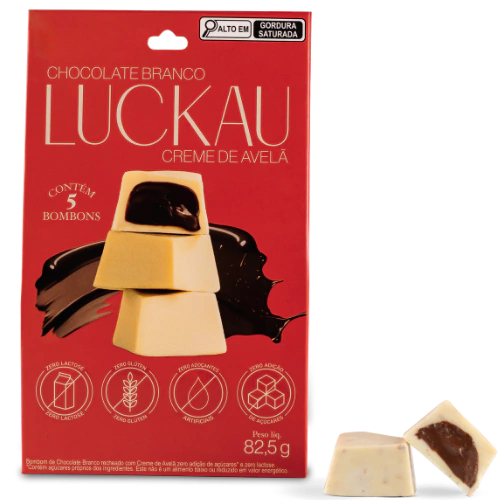 Pouch Cx Bombom Luckau Branco com Creme de Avelã SEM GLÚTEN SEM LACTOSE SEM AÇÚCAR - 5 unidades de 16,5g - 82,5g