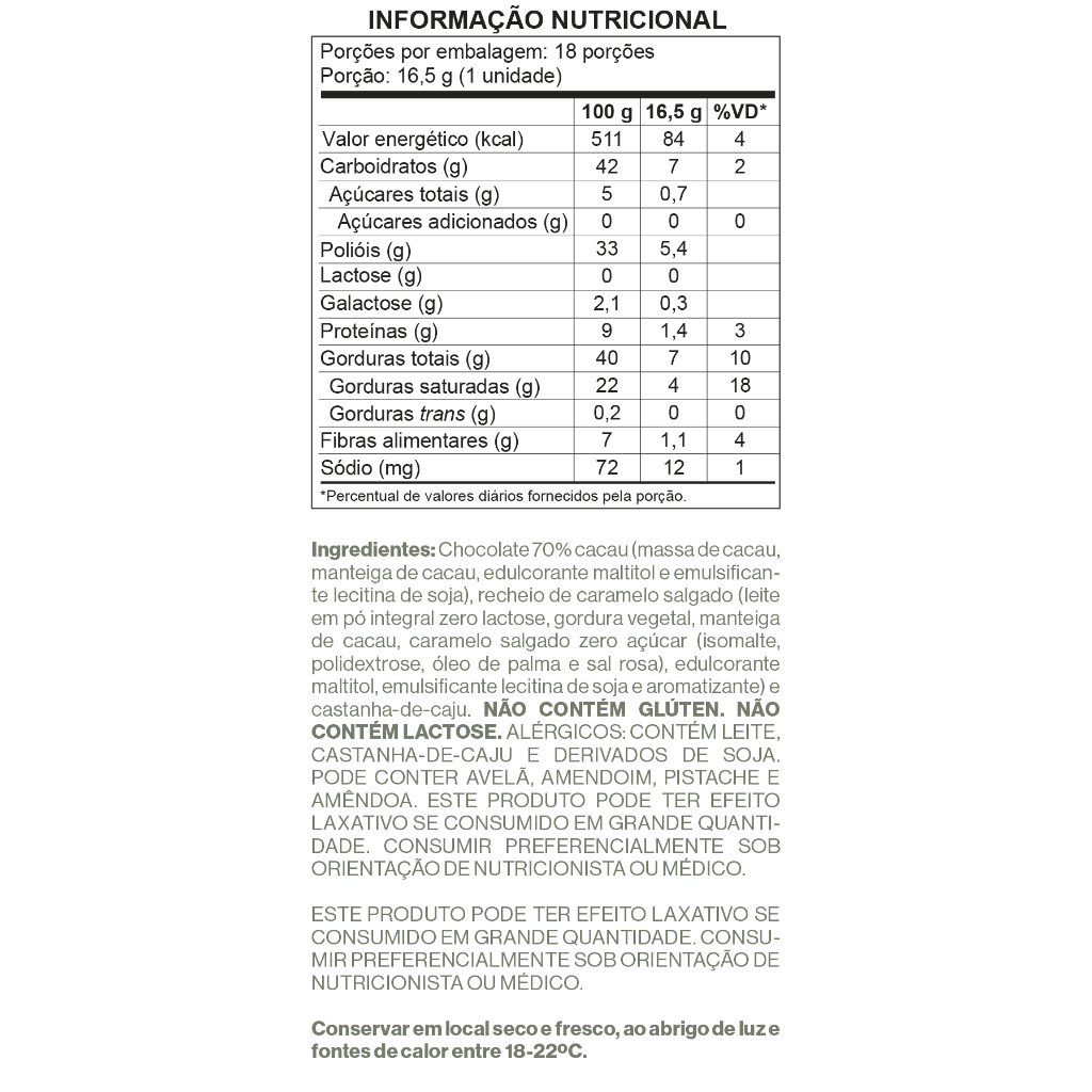Display Bombom 70% c Caramelo Salgado SEM GLÚTEN SEM LACTOSE SEM AÇÚCAR -18 unidades de 16,5g - 297g