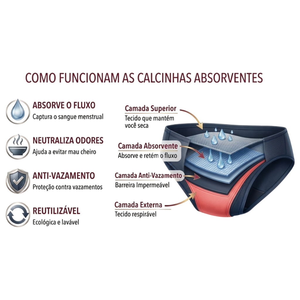 Calcinha Absorvente Menstrual Antivazamento Fluxo Intenso Dia e Noite Confortável Feminina