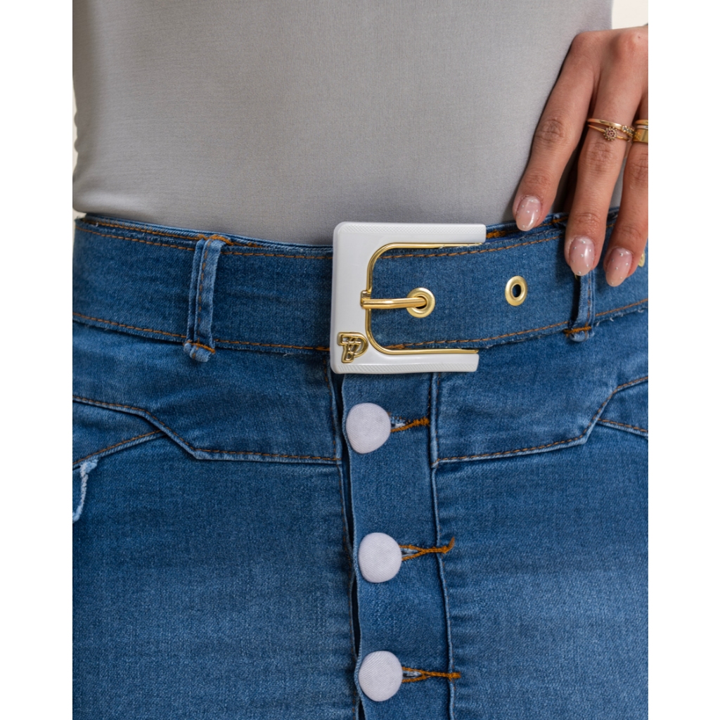Saia Secretária Jeans com Cinto e Recortes Desfiados Modernos 7Pallas