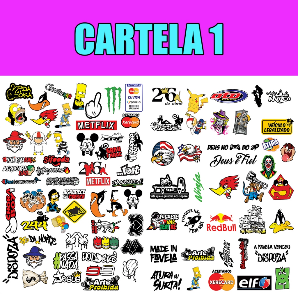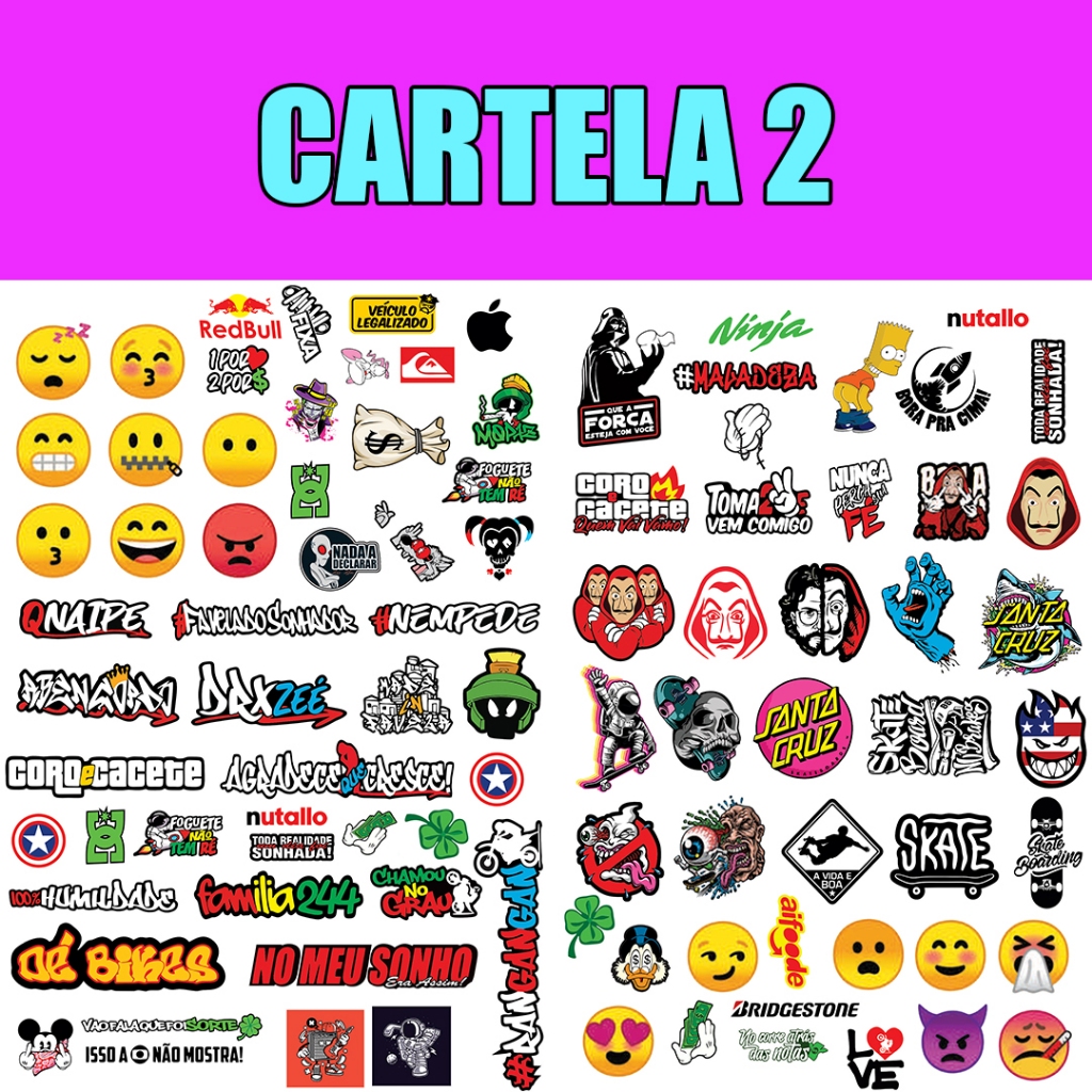 Super Cartela Kit 90 Unidades Stickers Adesivos Moto Bike Carro Pc Computador Celular Notebook IMP