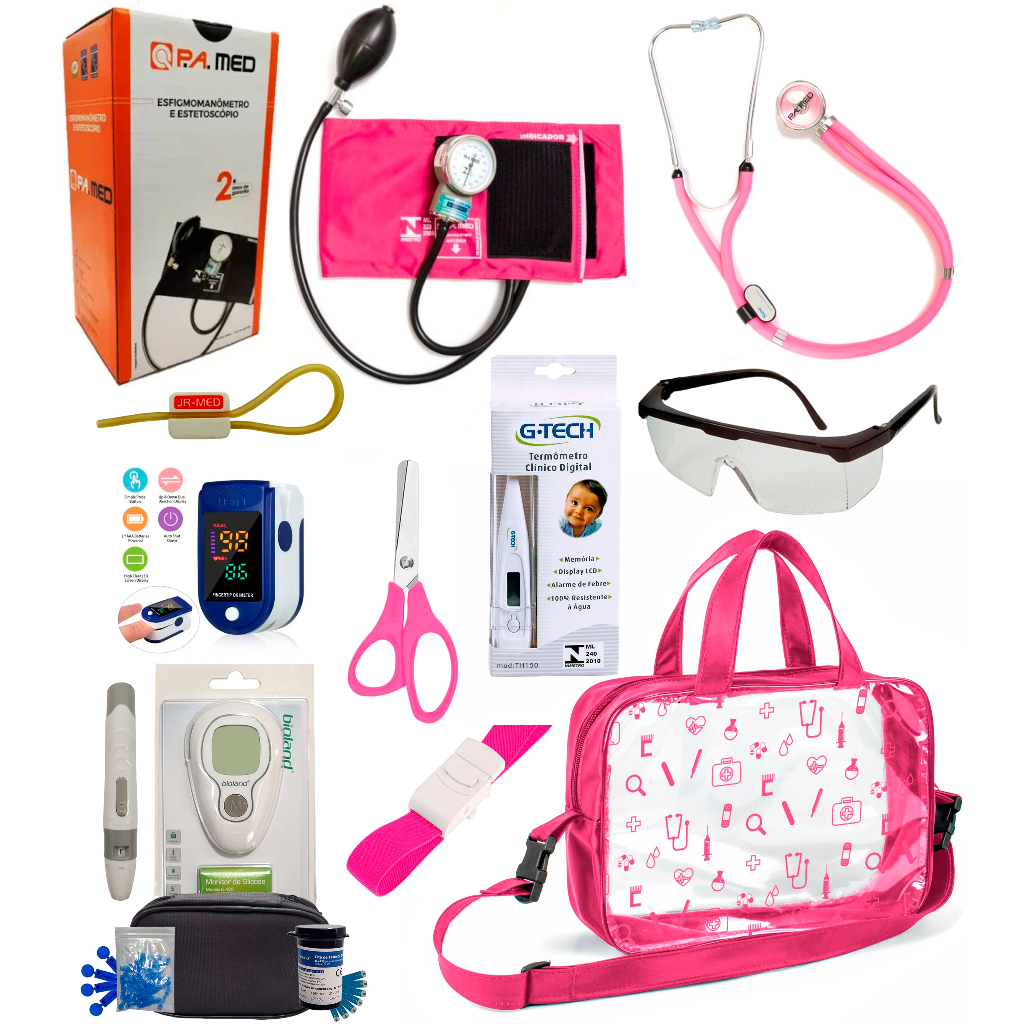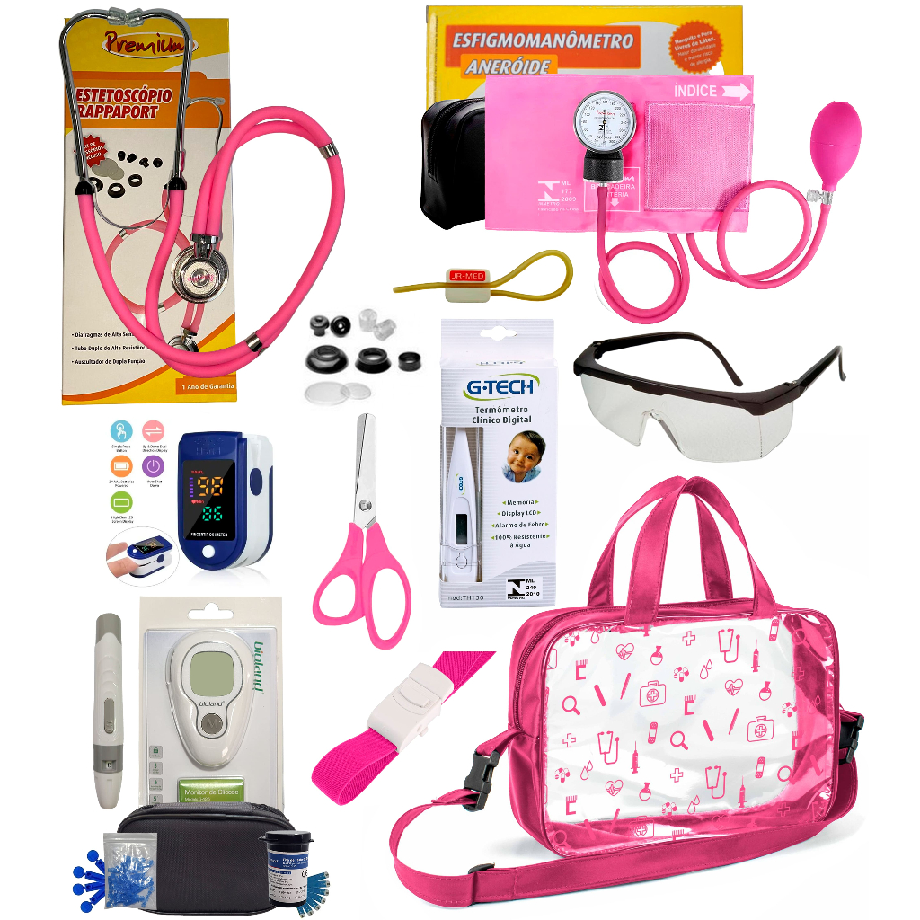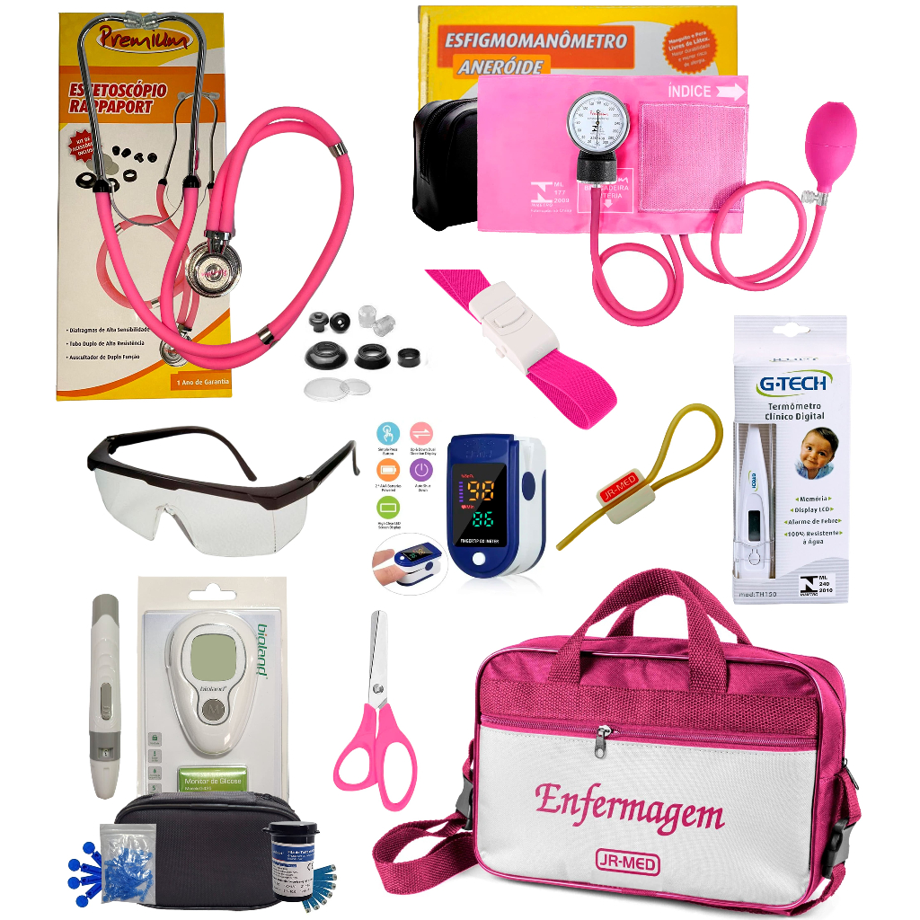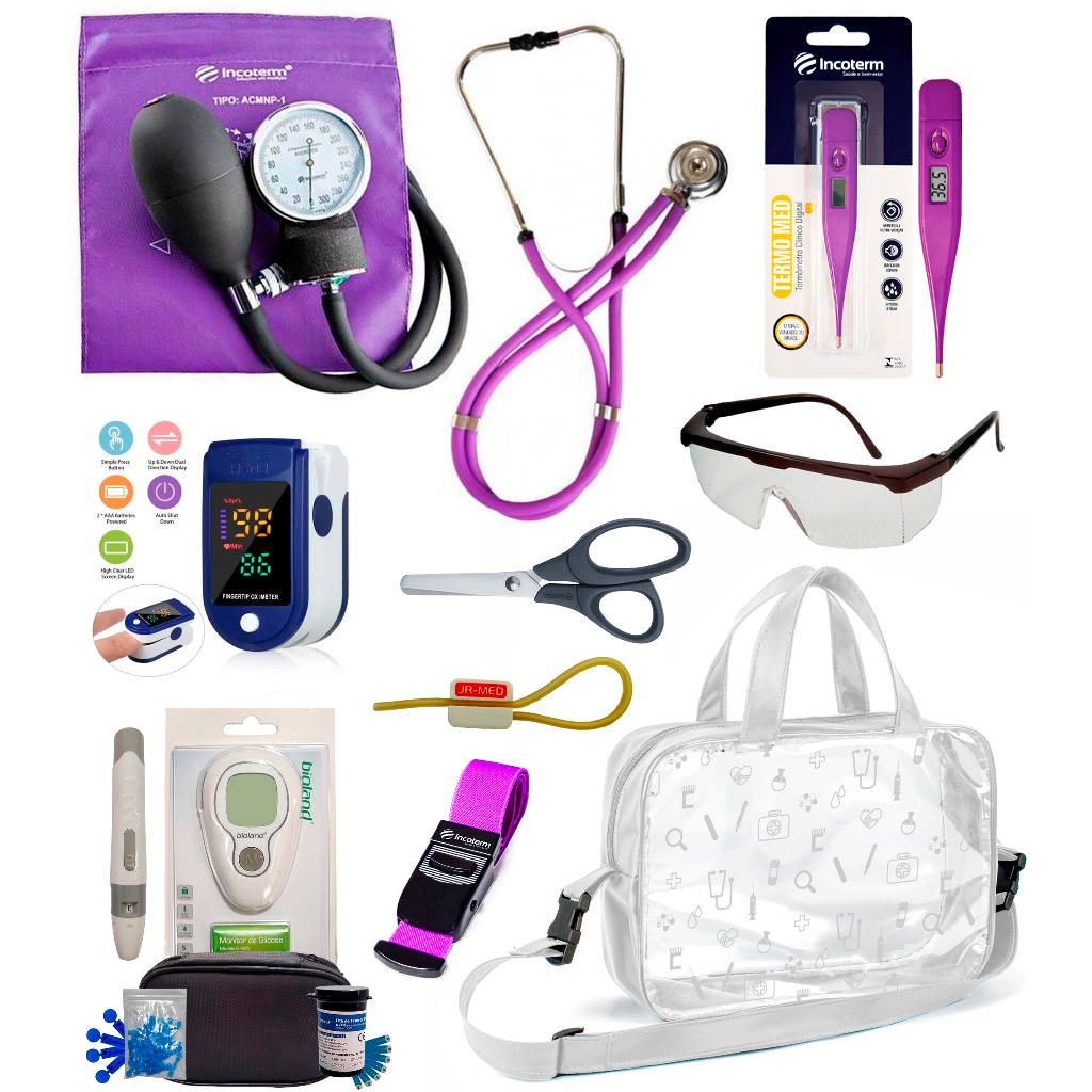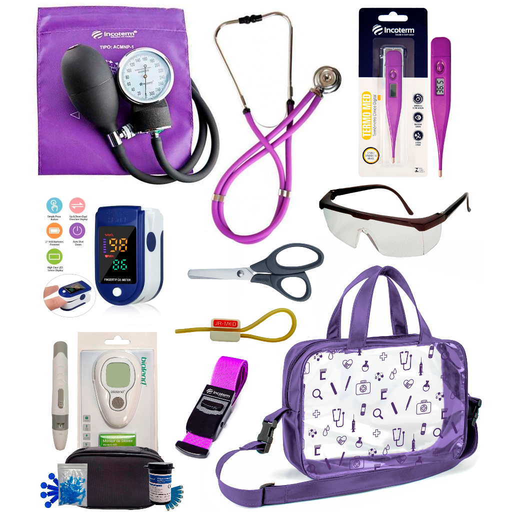 Kit Enfermagem Completissimo OXIMETRO E GLICOSÍMETRO + Bolsa Estágio VINHO AZUL PRETO PINK LILÁS