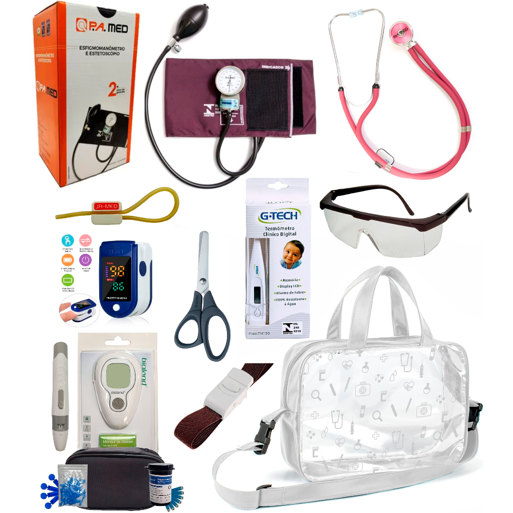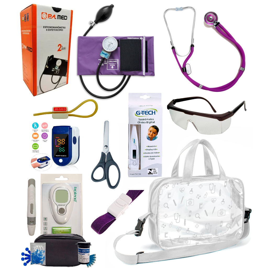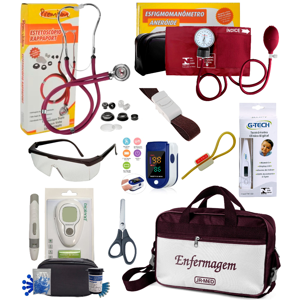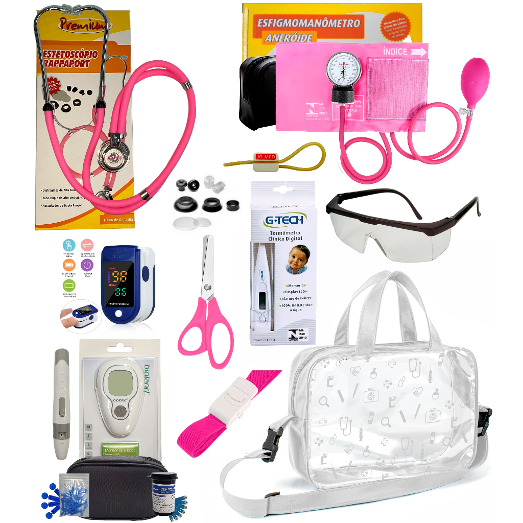 Kit Enfermagem Completissimo OXIMETRO E GLICOSÍMETRO + Bolsa Estágio VINHO AZUL PRETO PINK LILÁS