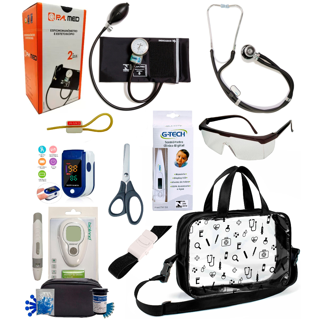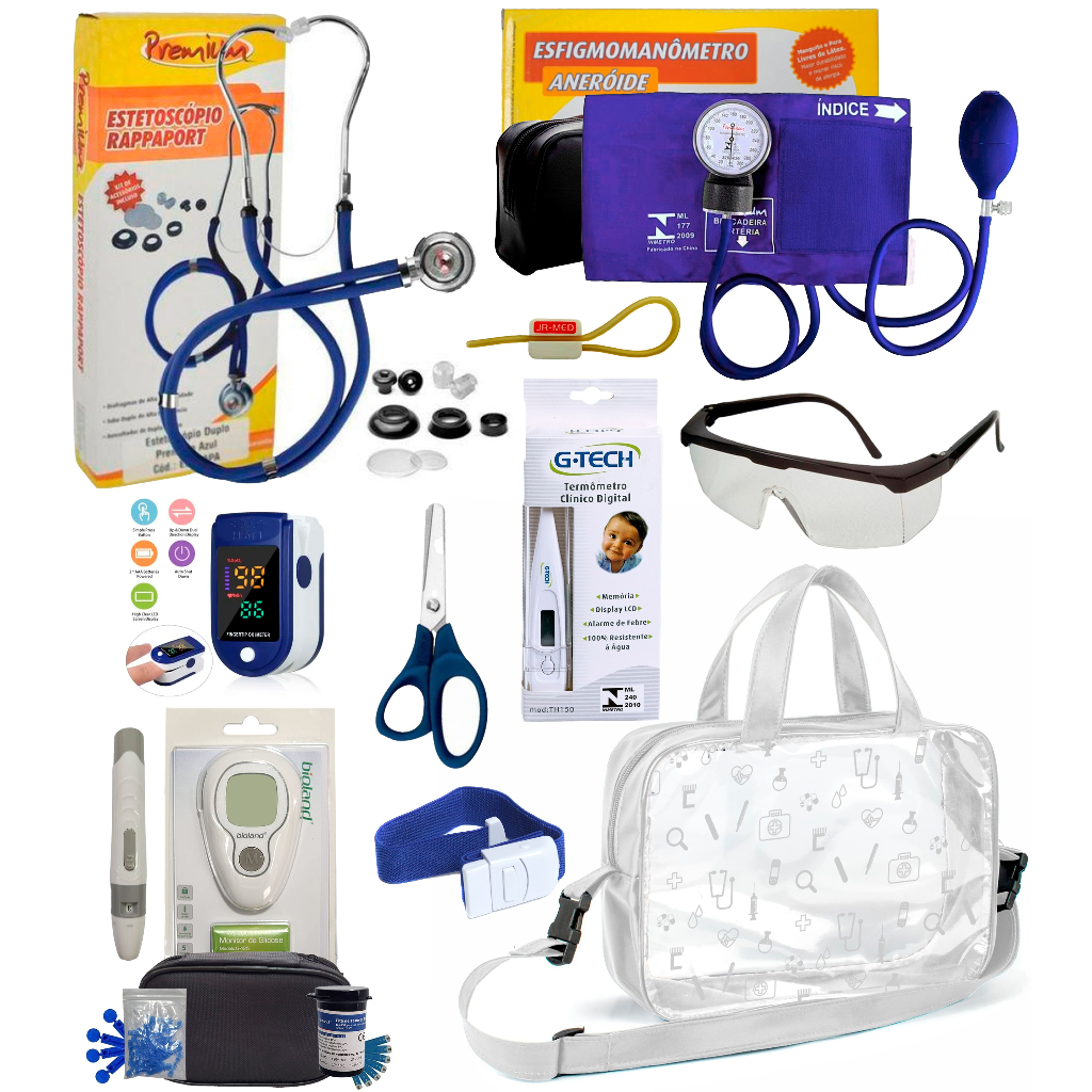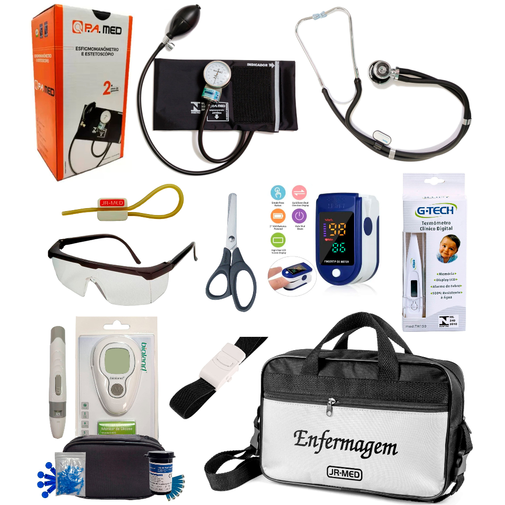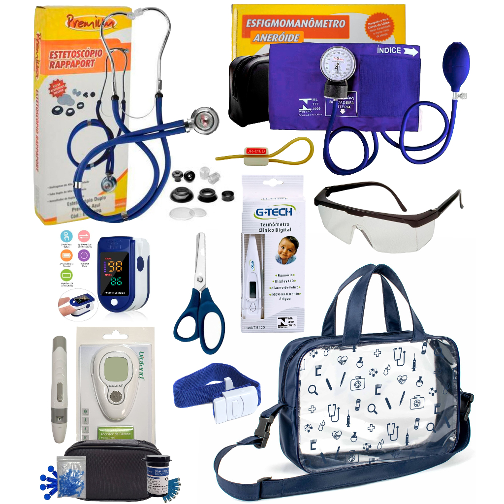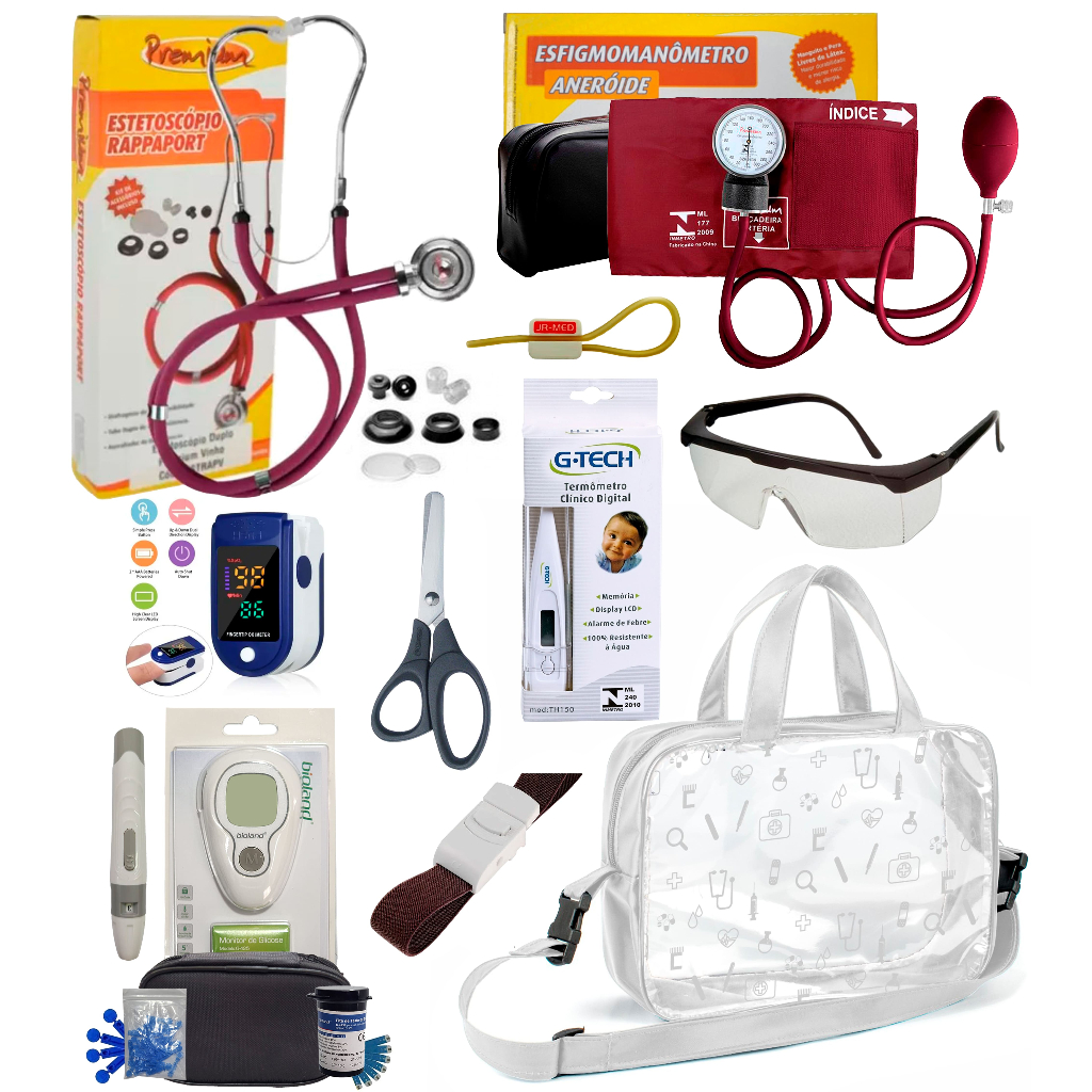 Kit Enfermagem Completissimo OXIMETRO E GLICOSÍMETRO + Bolsa Estágio VINHO AZUL PRETO PINK LILÁS