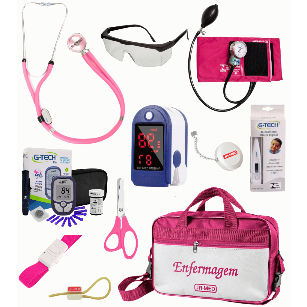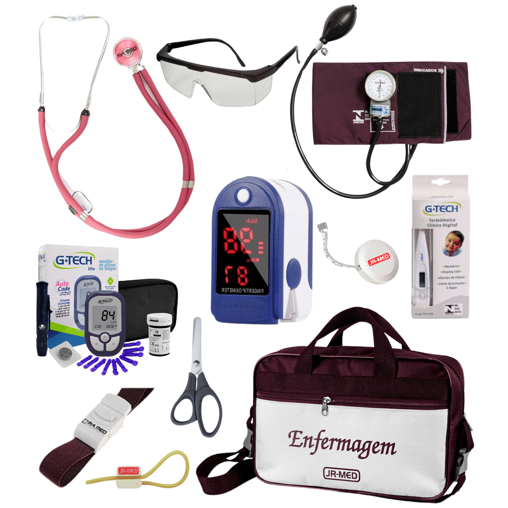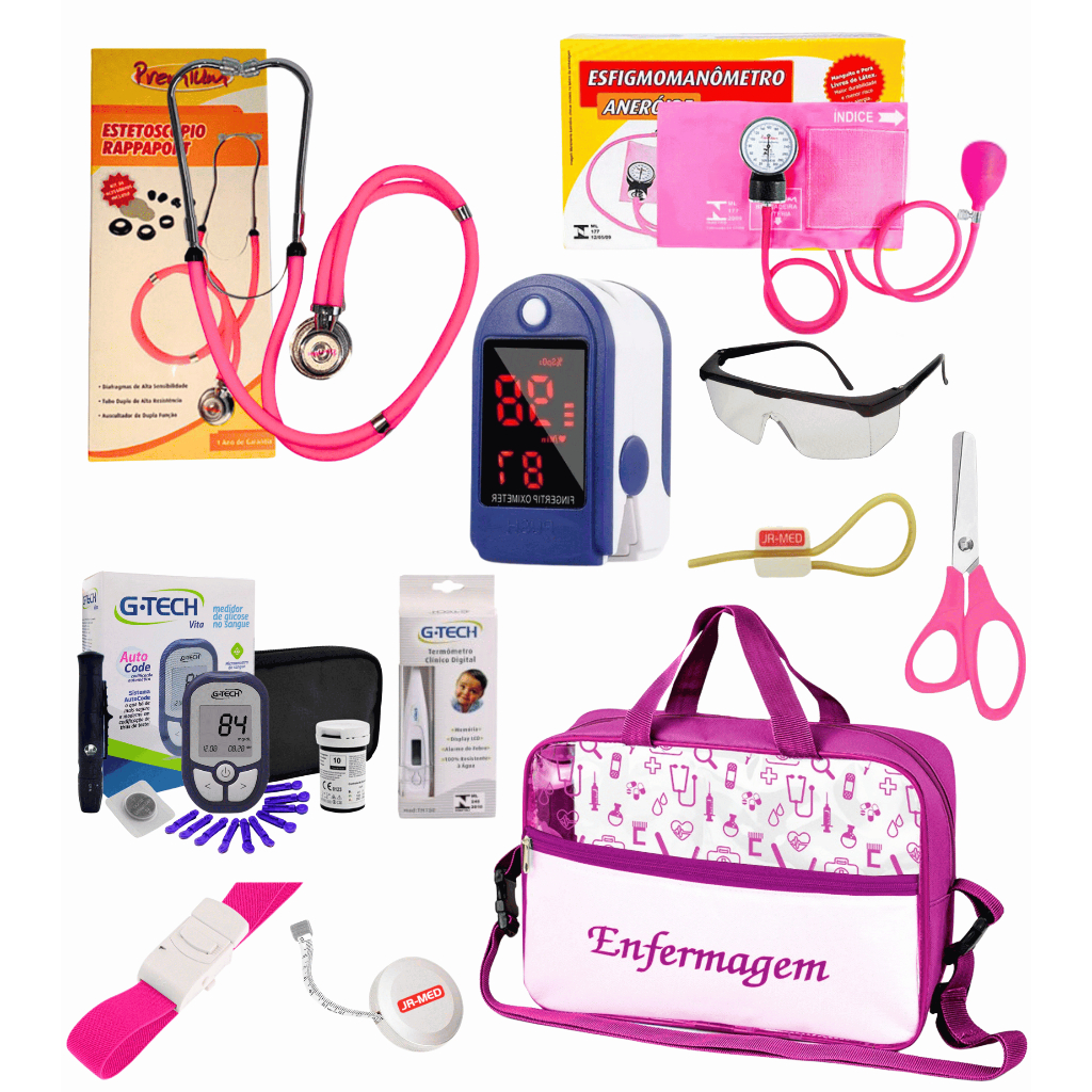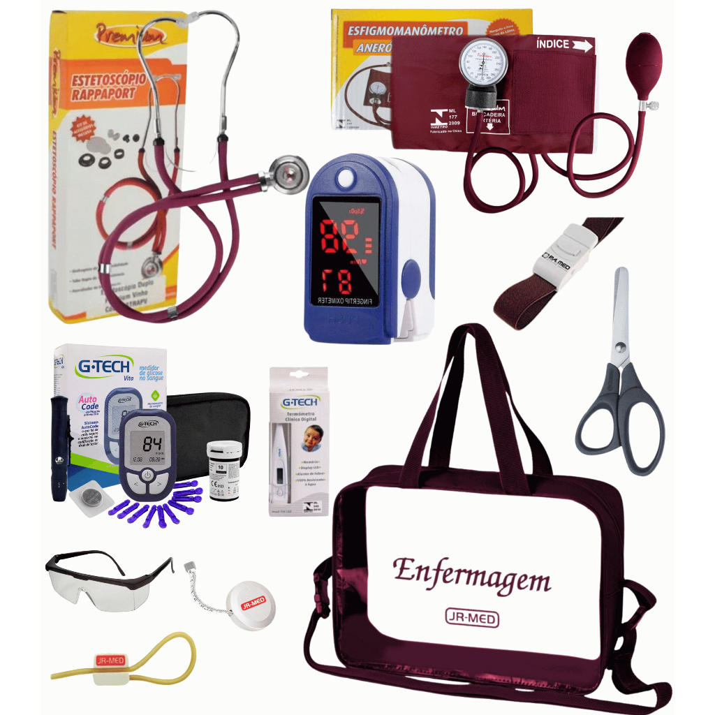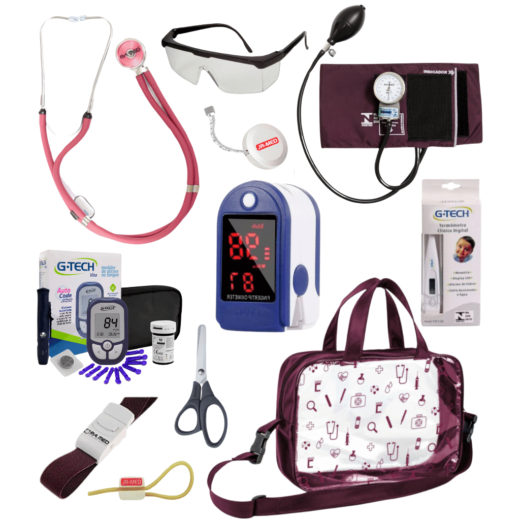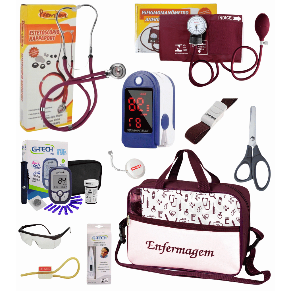 Kit Material de Enfermagem Aparelho de Pressão + Estetoscópio Duplo Premium para Estágio com Oximetro - VINHO ROSA PRETO