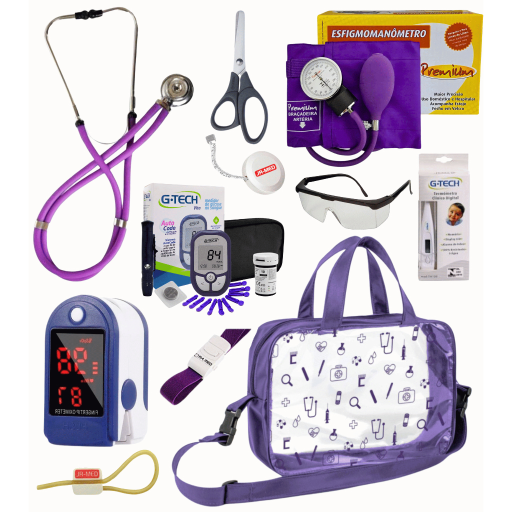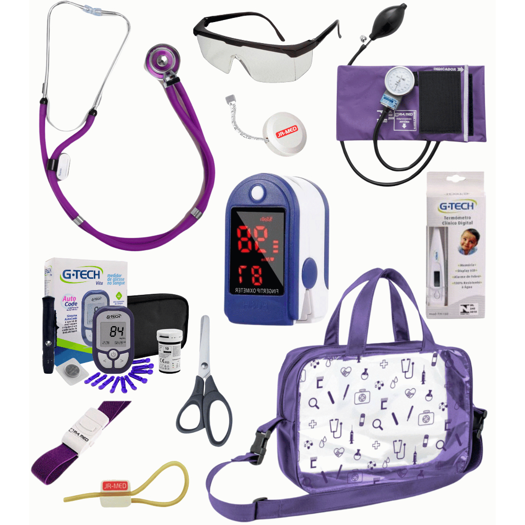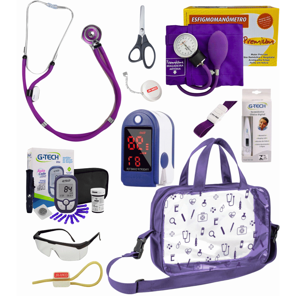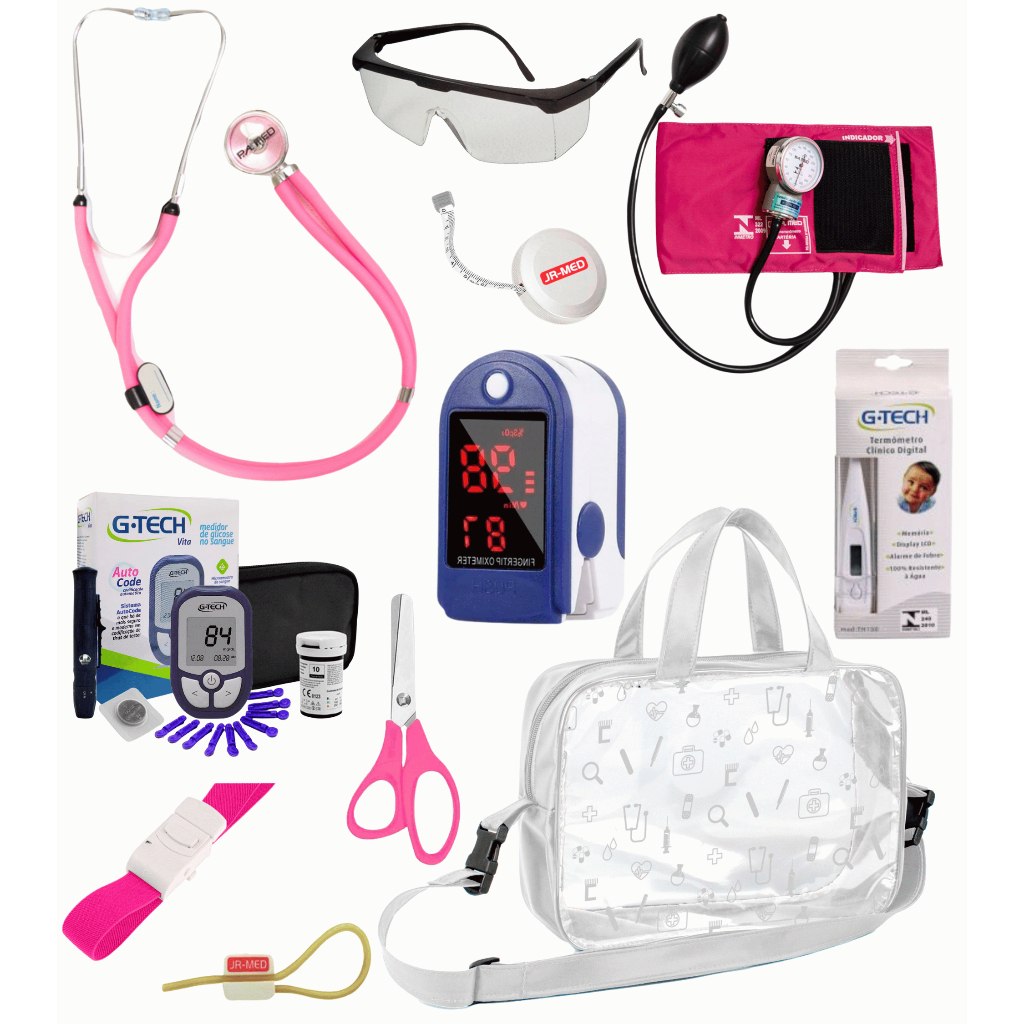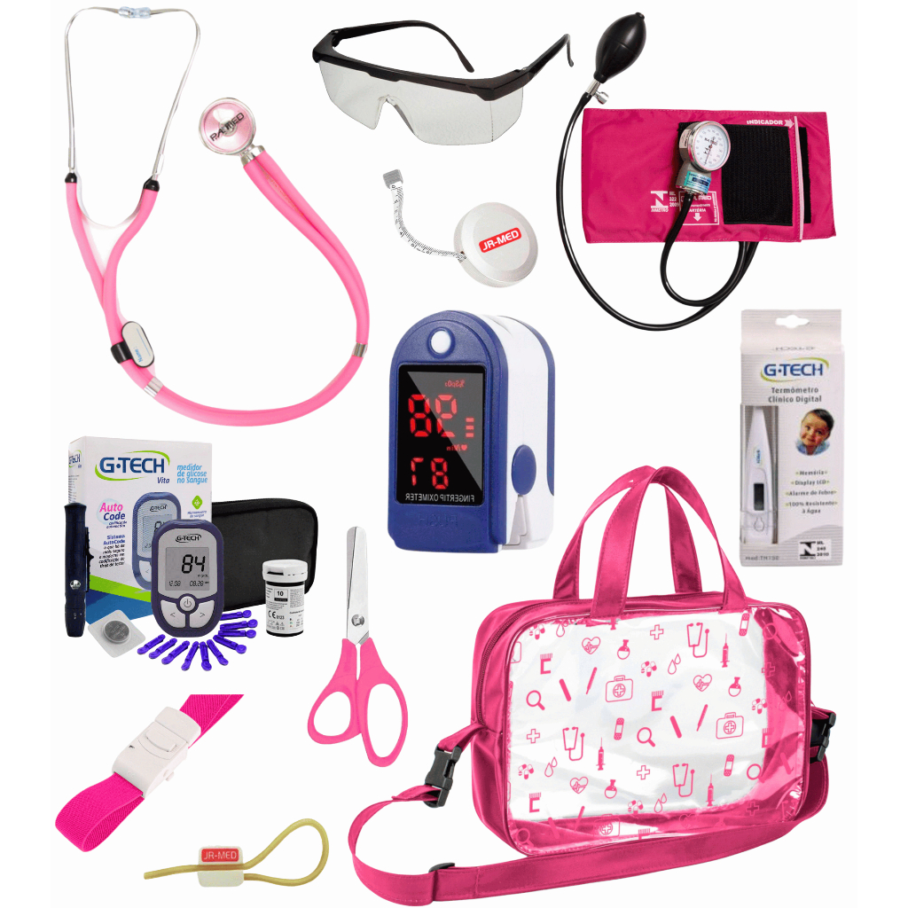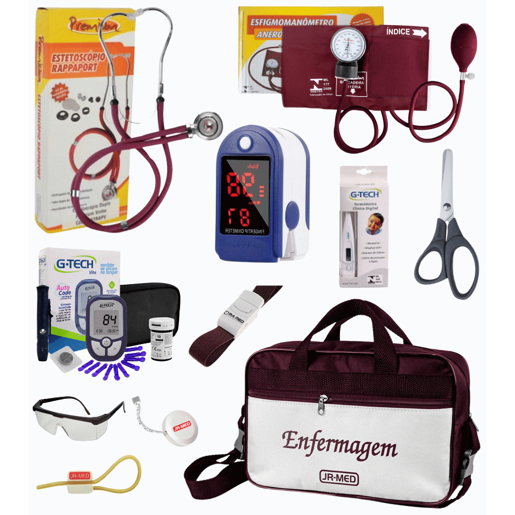 Kit Material de Enfermagem Aparelho de Pressão + Estetoscópio Duplo Premium para Estágio com Oximetro - VINHO ROSA PRETO