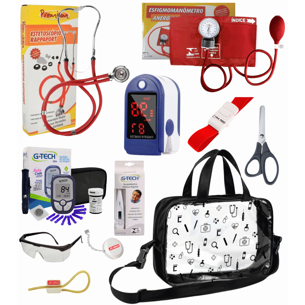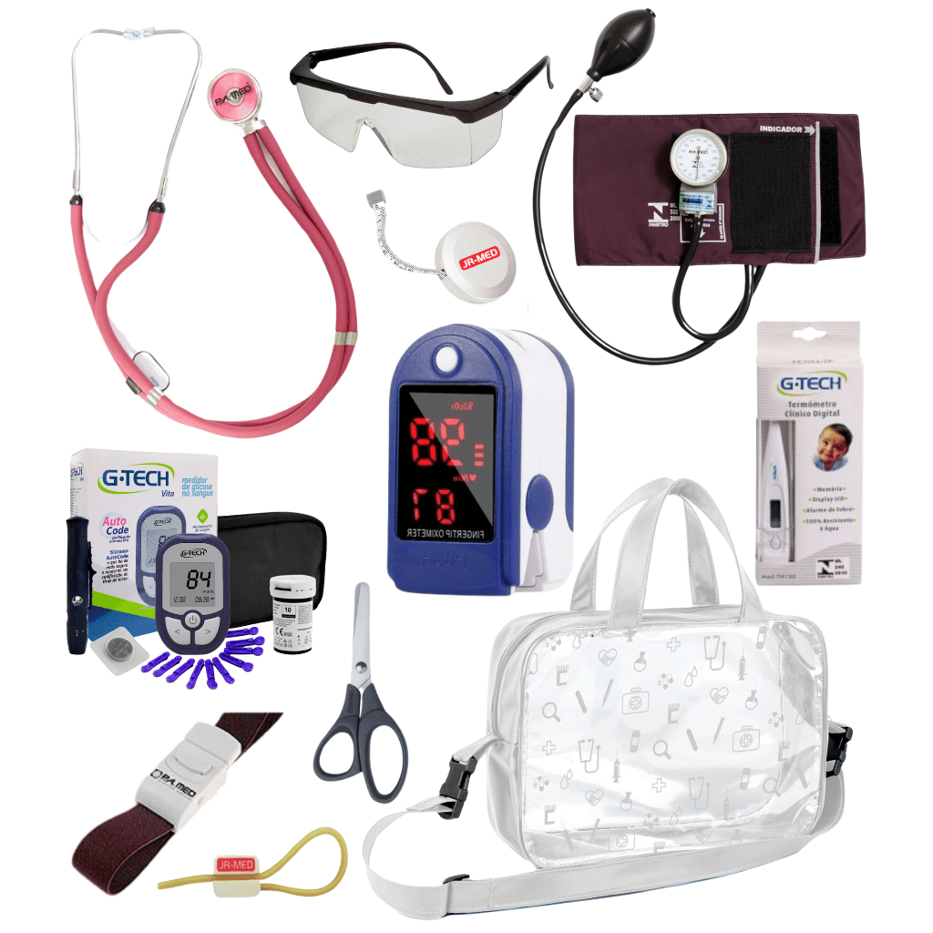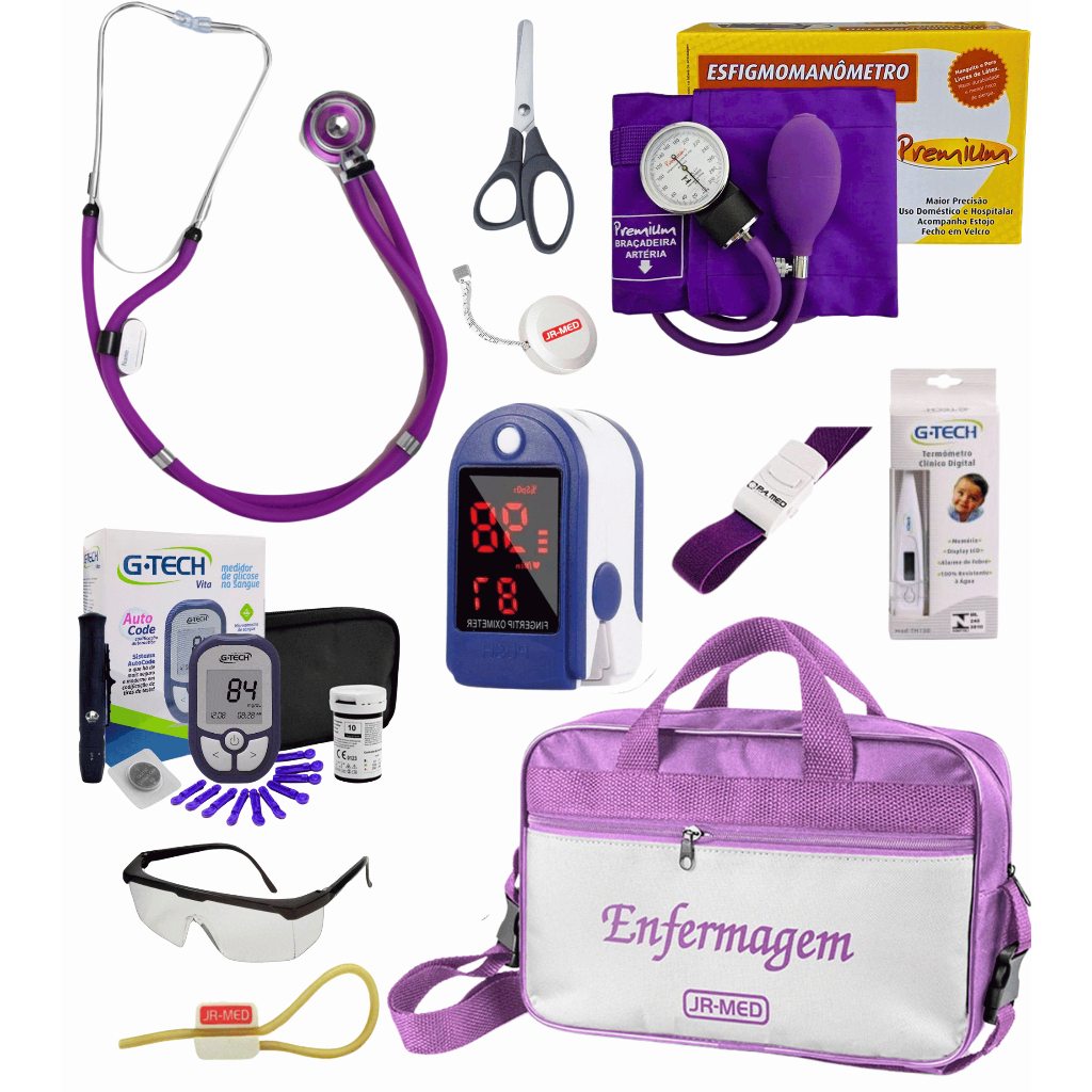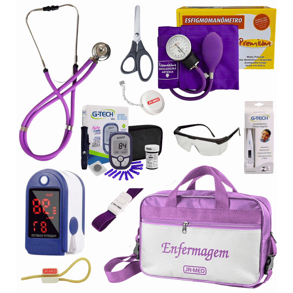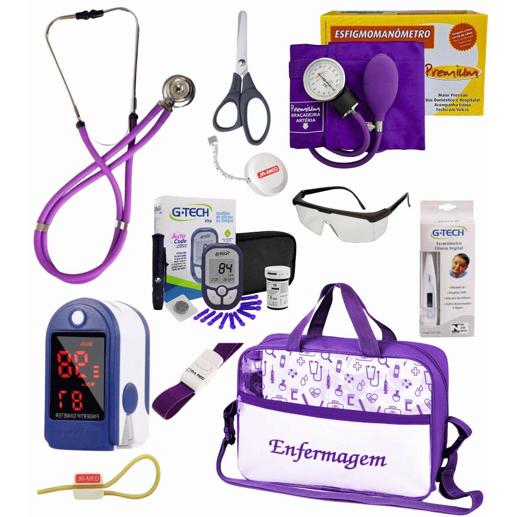 Kit Material de Enfermagem Aparelho de Pressão + Estetoscópio Duplo Premium para Estágio com Oximetro - VINHO ROSA PRETO