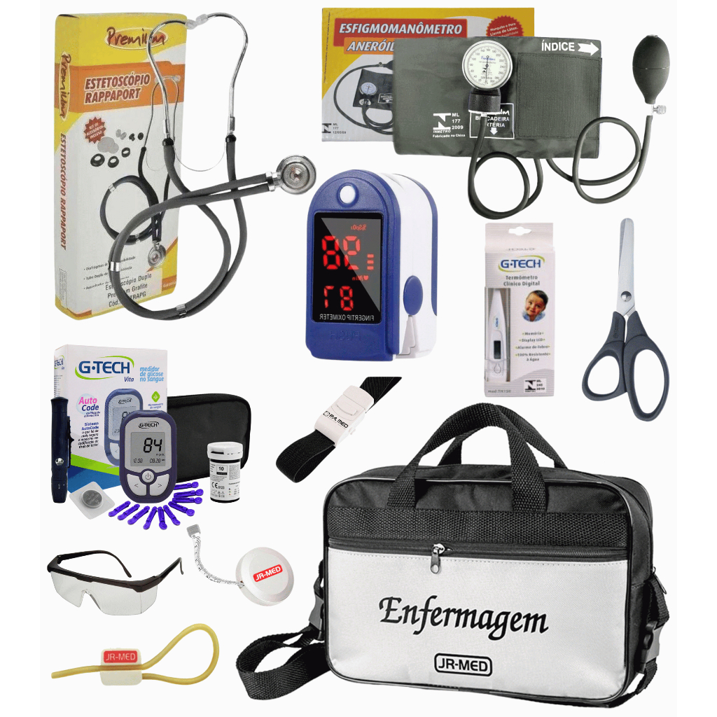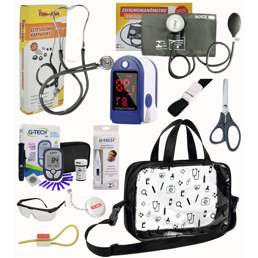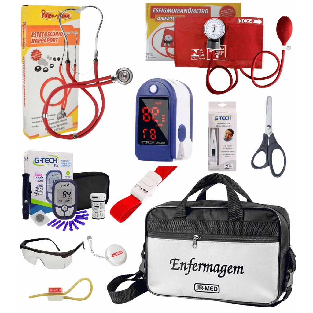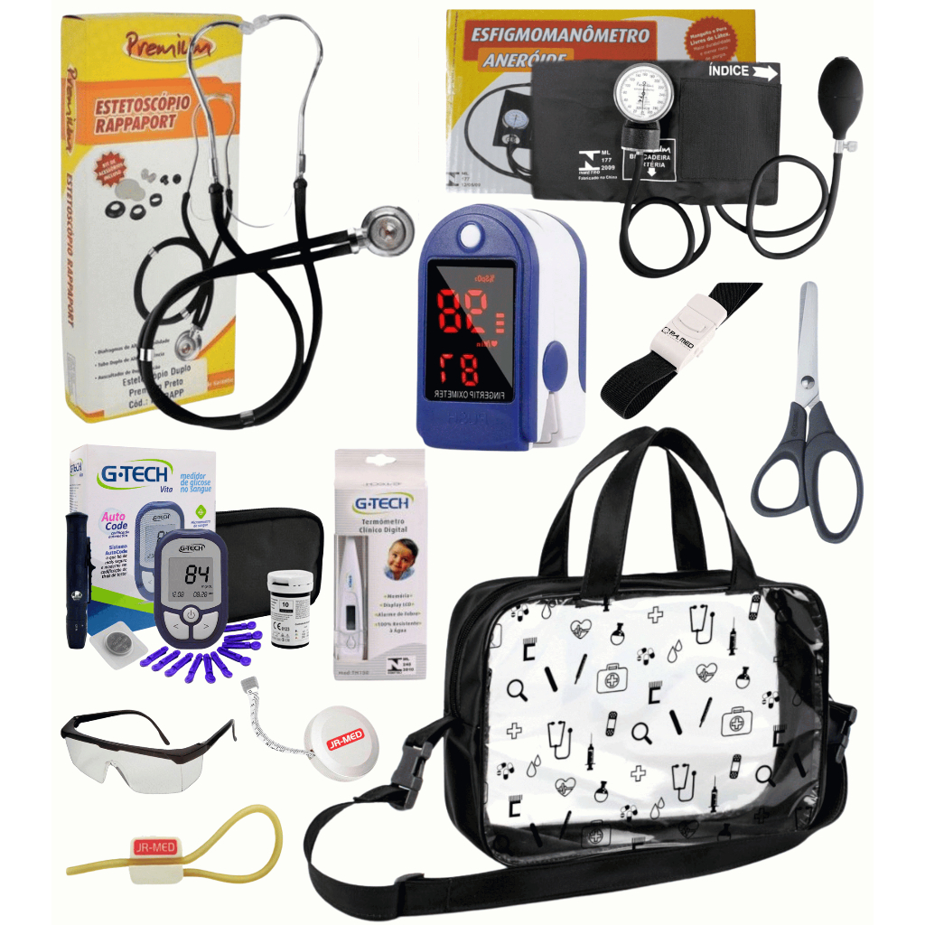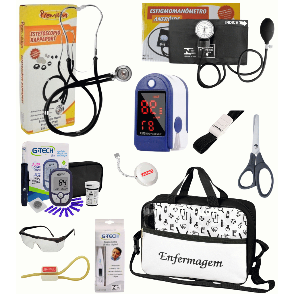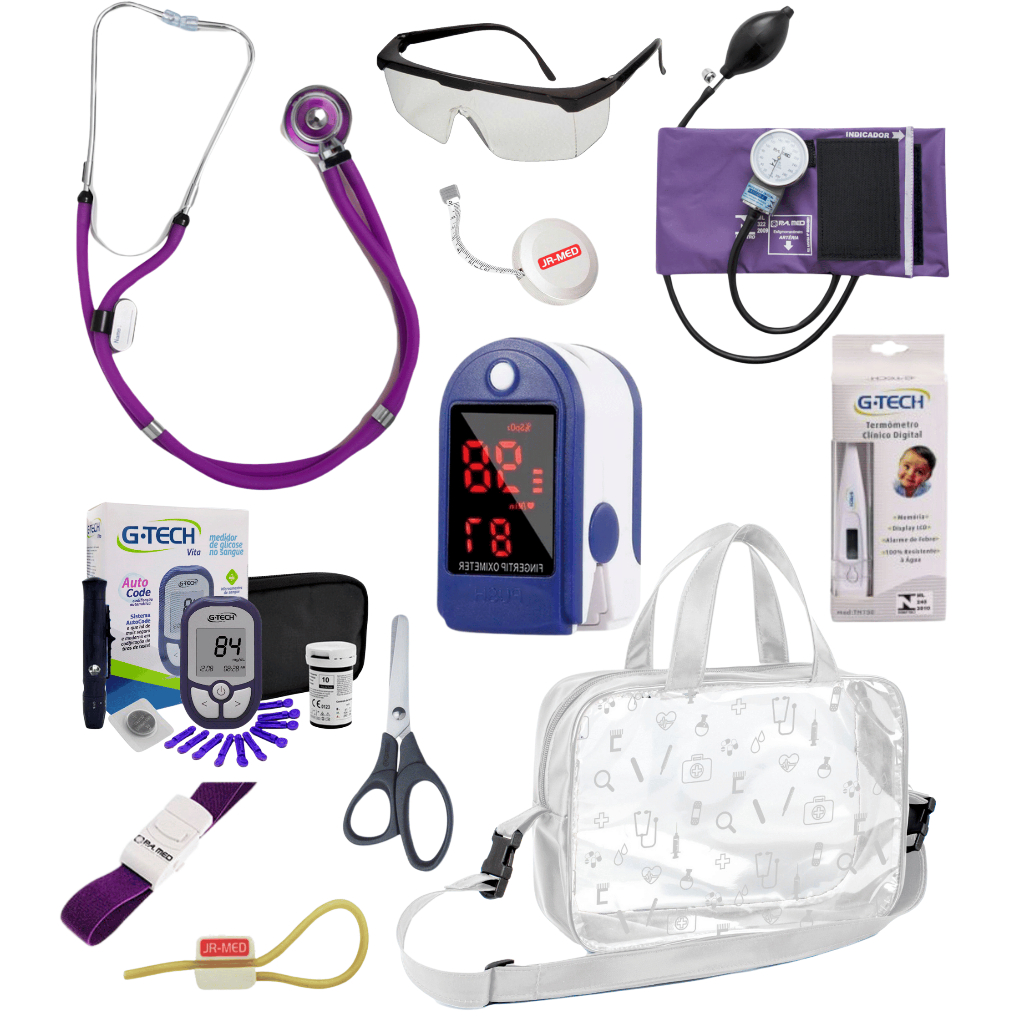 Kit Material de Enfermagem Aparelho de Pressão + Estetoscópio Duplo Premium para Estágio com Oximetro - VINHO ROSA PRETO