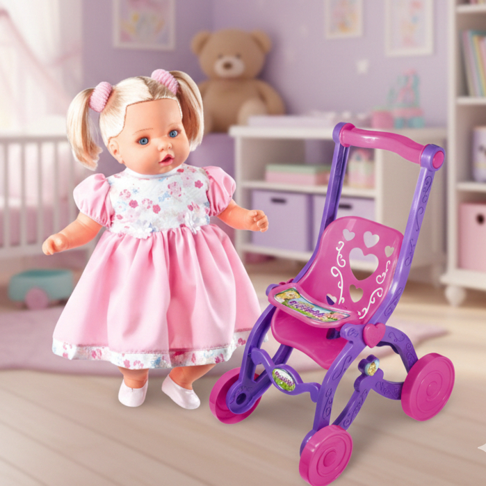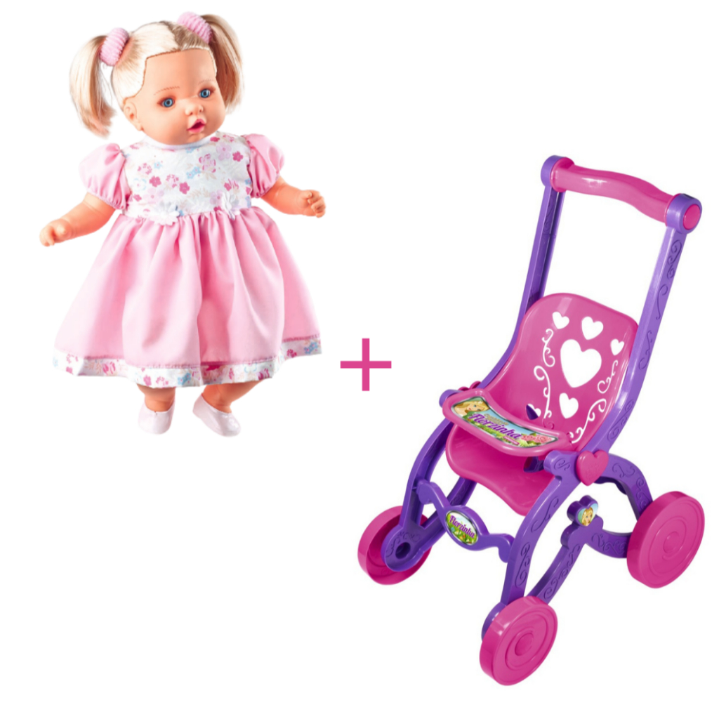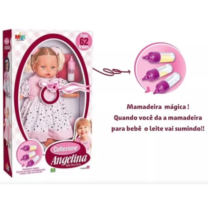 Boneca Angelina Fala 62 Frases mamadeira magica com carrinho passeio bebe para boneca florzinha kit