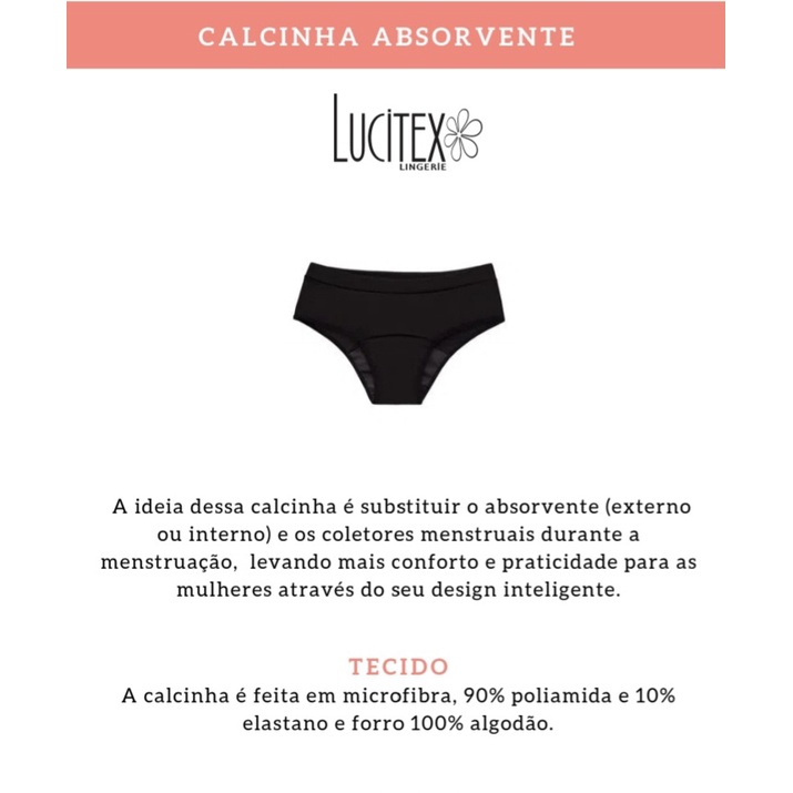 Calcinha Absorvente Menstrual Reutilizável Lucitex Fluxo Médio Menstruação Lavável