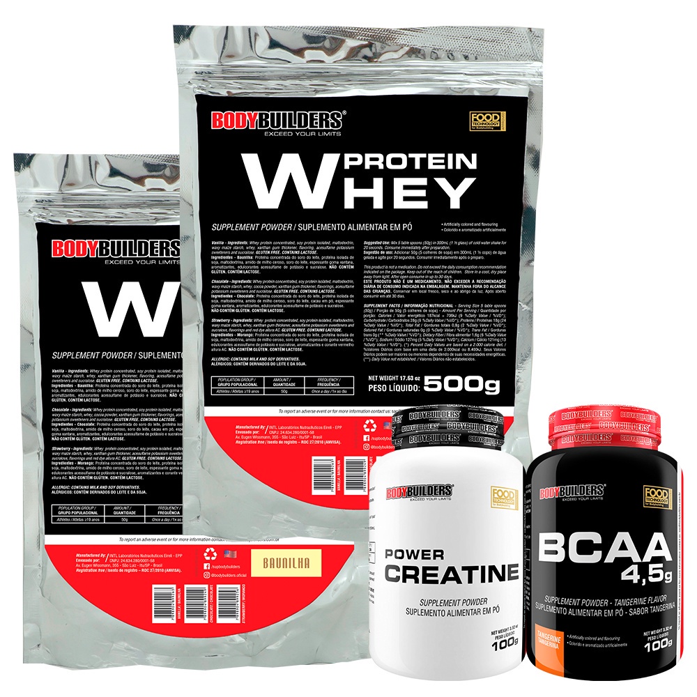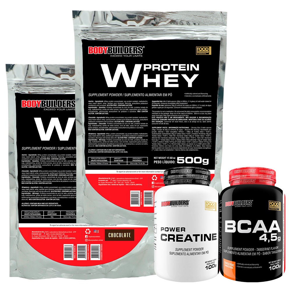 Kit 2x Whey Protein Concentrado 500g + BCAA 100g + Power Creatina 100g - Bodybuilders