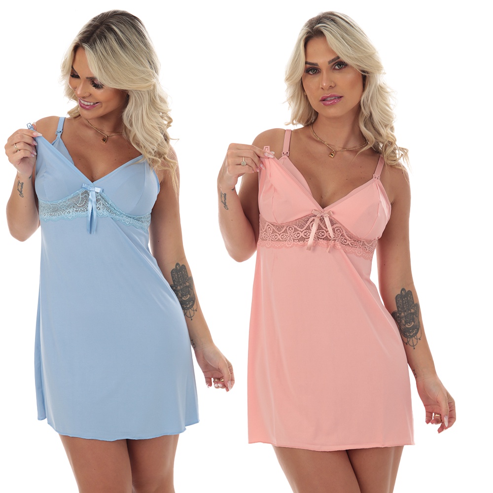Kit 2 Camisolas Amamentação Pós Parto Microfibra Detalhe Em Renda Gravida Saída Maternidade