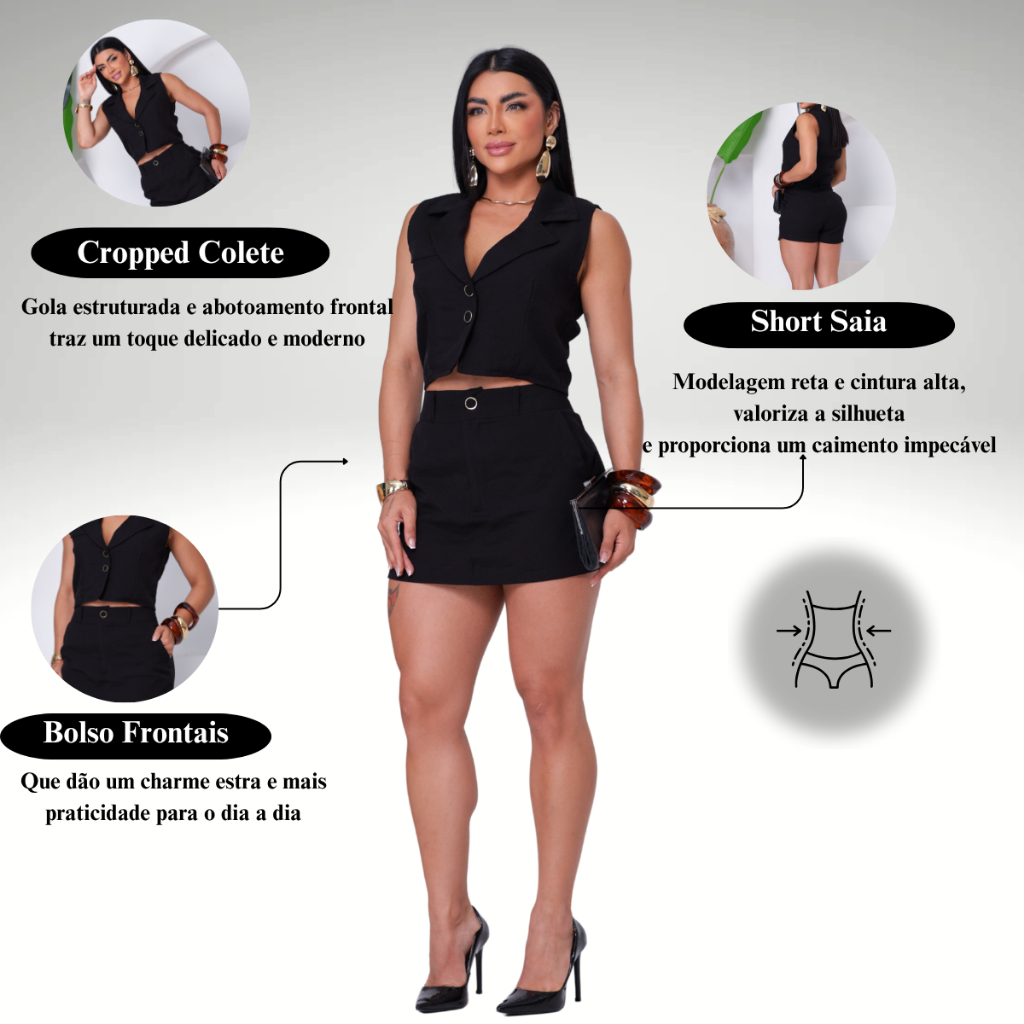 Conjunto Feminino Colete Shorts Saia Alfaiataria Marrant Tedência Moda Casual Social