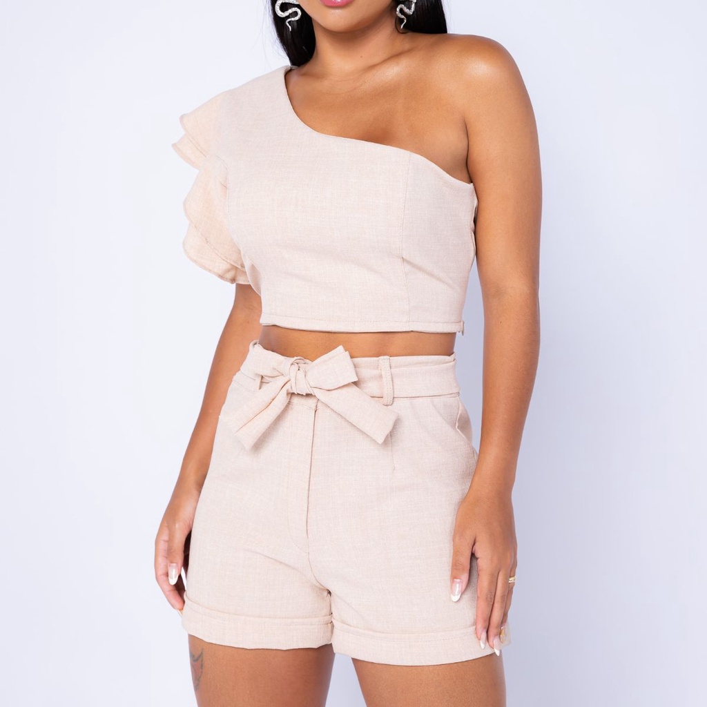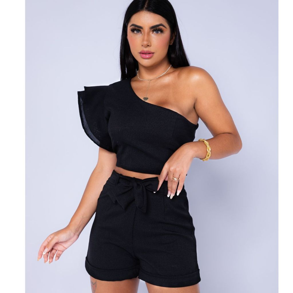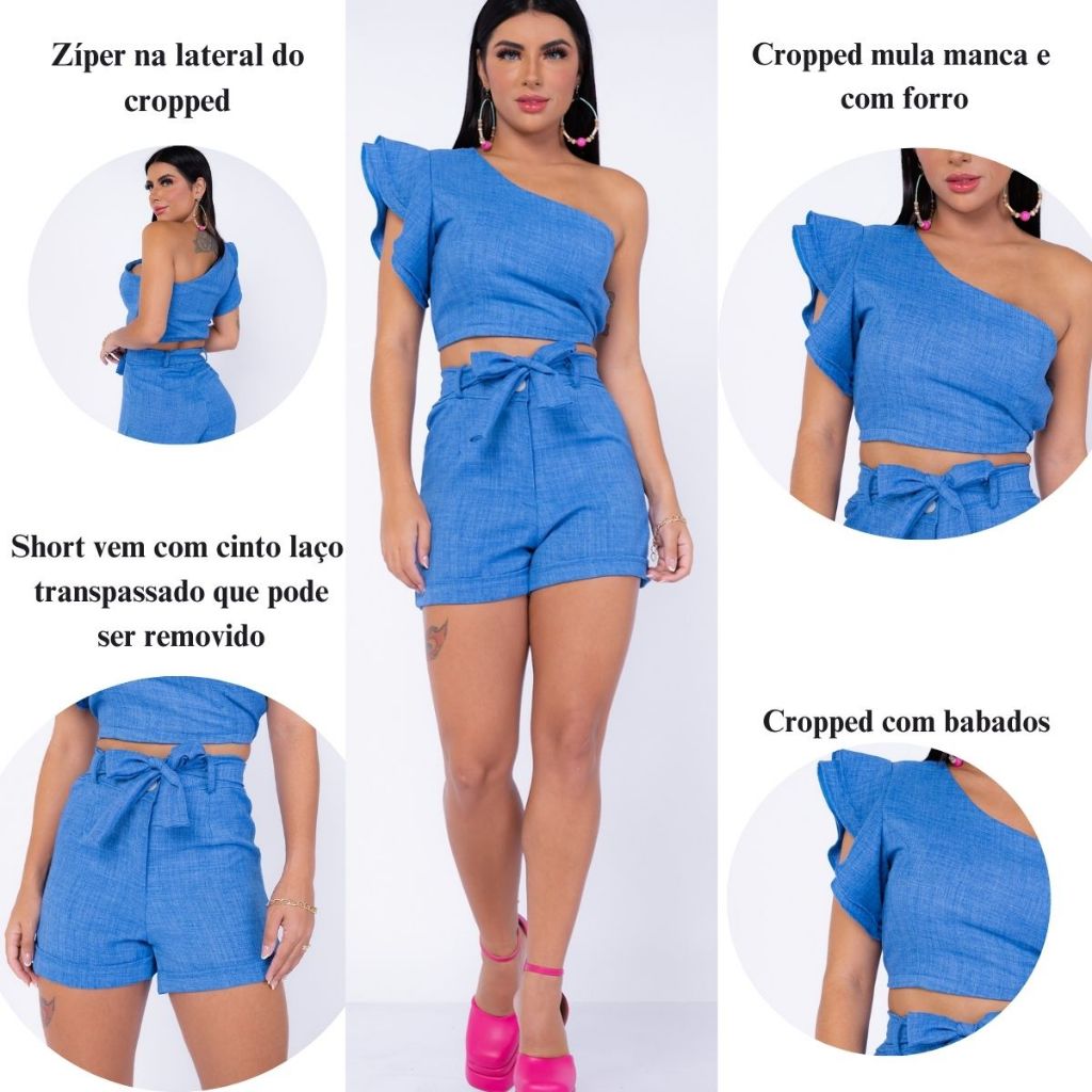Conjunto Feminino em linhão Shorts e Cropped Mula Manca Tedência Primavera Verão Promoção 2026