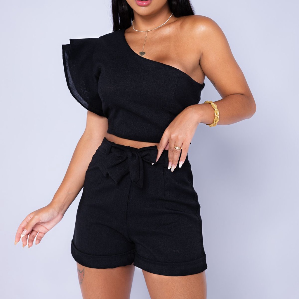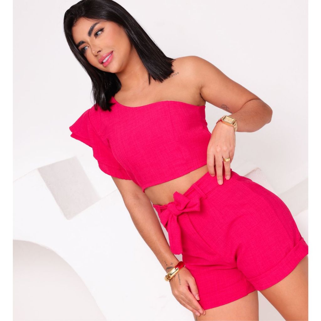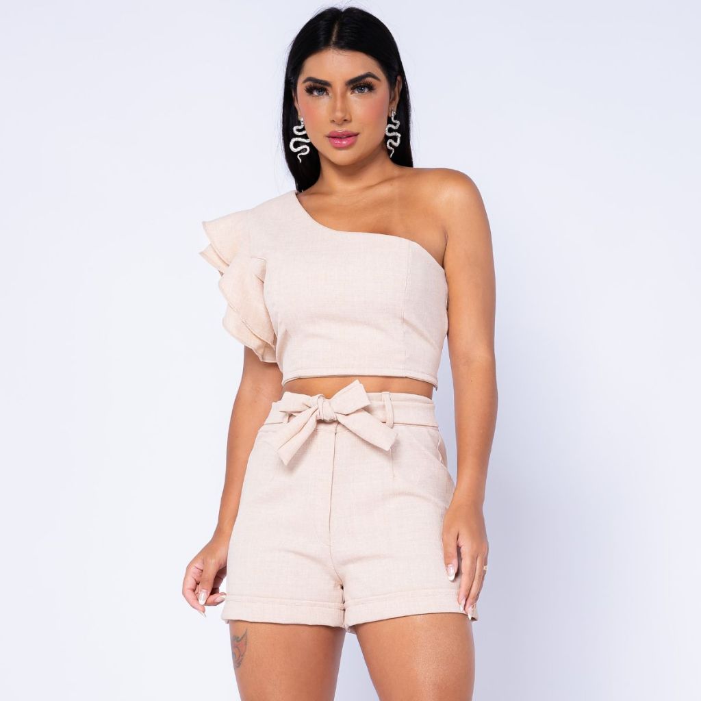 Conjunto Feminino em linhão Shorts e Cropped Mula Manca Tedência Primavera Verão Promoção 2026